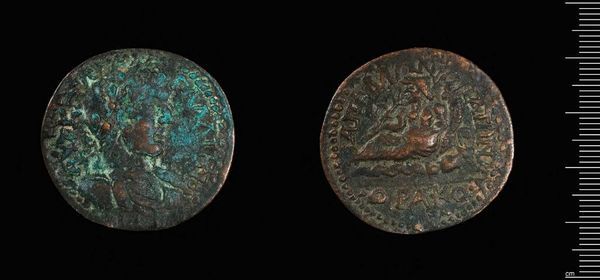 Editor: Here we have a coin, titled Coin (AE2) of Magnentius. It’s undated and attributed to Magnentius. The coin's surface is heavily patinated, almost a verdigris green, which obscures some of the finer details, but it’s amazing to see it still exists after so long. What do you see in this piece? Curator: The very visible erosion is itself a significant element. Consider how the disintegration of the metal transforms the depicted imagery, forcing us to engage with absence as much as presence. The semiotic weight shifts from the intended imperial message to a meditation on time and decay. Editor: That’s a great point. It’s not just what’s there, but what’s missing. Thanks! Curator: Indeed. The aesthetic experience resides as much in this dialogue with loss as in the original form.