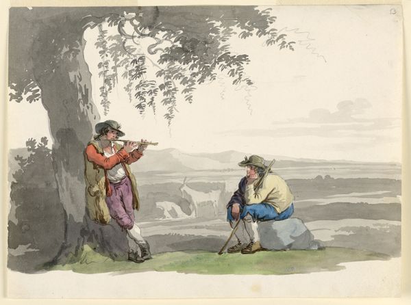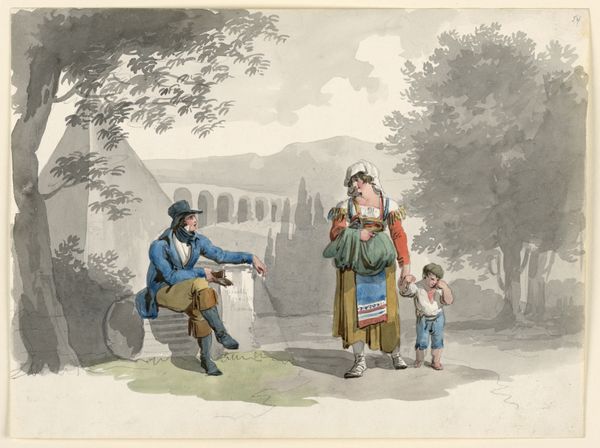 Editor: So, here we have Bartolomeo Pinelli's "At a Stream in the Mountains near Rome," created around 1808. It's a drawing with pencil and watercolor, quite delicate actually. It depicts women by a stream, maybe washing clothes. There's something serene and earthy about it, yet… distant? What catches your eye? Curator: Distant...yes, a poignant observation! What I perceive is a glimpse into the theatre of everyday life, almost a stage setting. Imagine these women frozen, not mid-task, but mid-story. Do you see how the grey wash of the background contrasts the sharper details of the figures? This lends it an interesting tension – grounded yet dreamlike. It almost seems to mock the 'realness' of Neo-classicism in favor of a deeper romantic sensibility! Pinelli plays with our emotions through light and shadow. Does that resonate with you at all? Editor: Absolutely! The background *does* feel like a backdrop now that you mention it, and how the sharper detail sets the figures forward… almost sculptural! I'm beginning to see the story, though, just like you said, paused at a crucial moment. It's as though each is trapped by life circumstances... or their own making? Curator: Trapped by circumstance, perhaps even tradition? Though, perhaps some are finding ways of making joy regardless? Pinelli invites this complexity of emotion. We bring ourselves, as always, to truly make it "whole" again, each one a story just waiting to unfurl. So which do *you* think, joyful… or melancholy? Perhaps... both, always! Editor: I'd say a definite "both." I’m noticing all the nuanced tension now, even just in where they place their weight and look, there is joy and hardship at war! This picture really makes you pause... Thank you! Curator: My pleasure entirely. Art always flourishes most wonderfully when it surprises and asks us of what's always really in our soul, I hope!