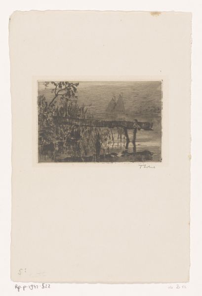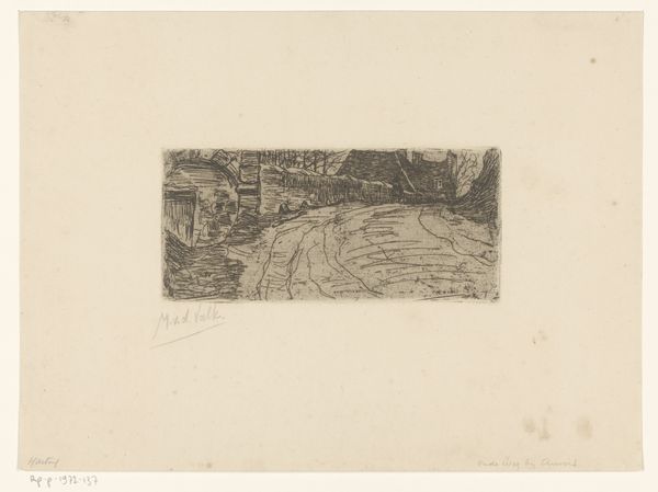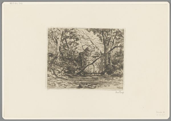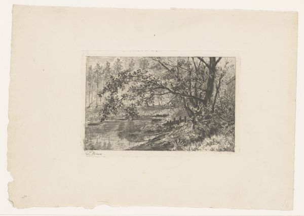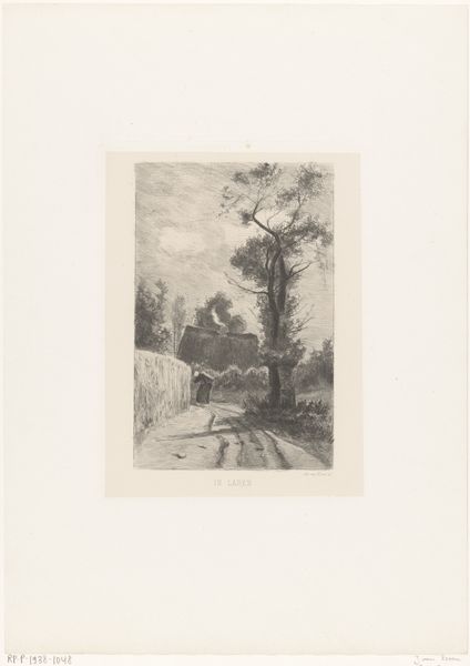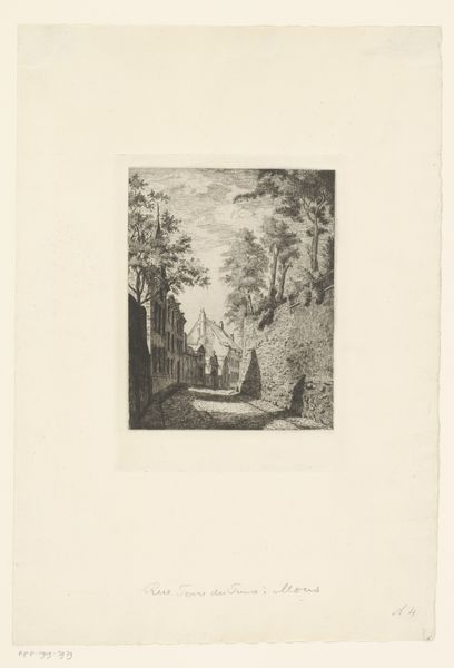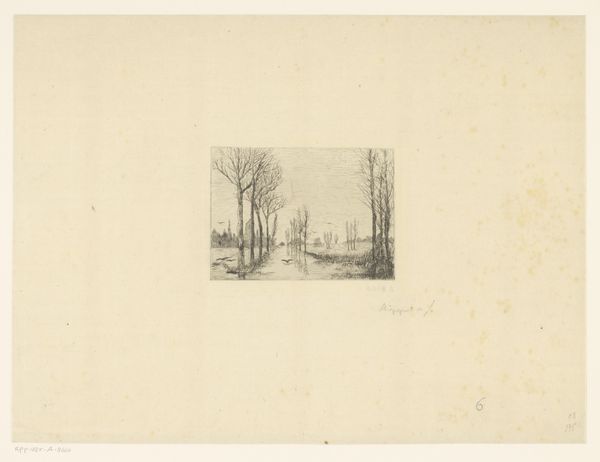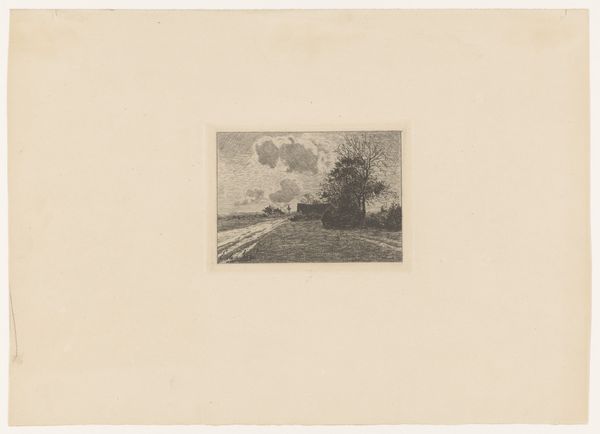 Editor: Here we have "Gezicht op Parc St. Cloud" created by Alfred Taiée in 1875. It's an etching, and my first thought is how the artist captures depth. The path seems to stretch endlessly. What do you see in this piece, considering the formal elements? Curator: Indeed, the artist masterfully utilizes linear perspective to achieve that sense of receding space. Observe how the lines converge towards the vanishing point, guiding the viewer's eye into the composition. Note also the careful modulation of light and shadow, creating depth through tonal contrast, and how the parallel lines create texture in the greenery. It appears rather geometric to me. What do you think about the line work? Editor: I see what you mean, especially how the etched lines are darker closer to the foreground to provide depth. Would the line variation signify that there may be different iterations in the artwork since this is an etching? Curator: Precisely. Consider that each plate and its impression creates a potentially unique state. However, observe beyond mere representation; consider the semiotics of space implied by the strong axis drawn with precision of line, its mirroring created by the tree placement on either side of this road. Do we read the visual language? Editor: So you are pointing out the interplay between lines, texture and form and the structured symmetry to suggest more than just landscape, a formal dialogue. What do you make of its realistic and impressionistic styles, then? Curator: A worthy consideration. This duality reflects the period's artistic transitions, doesn't it? Although classified with each artistic tendency, one must look closely at the materiality and lines which define its intrinsic qualities; it is in the dialogue that the landscape’s essence speaks. Editor: Thank you, that really changes how I look at the piece; shifting away from what's simply depicted to the art of depiction itself. Curator: The focus on formal elements enhances one's art appreciation.