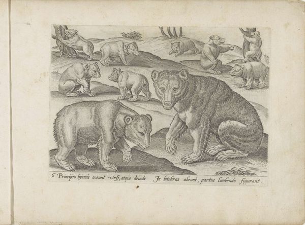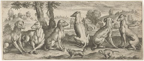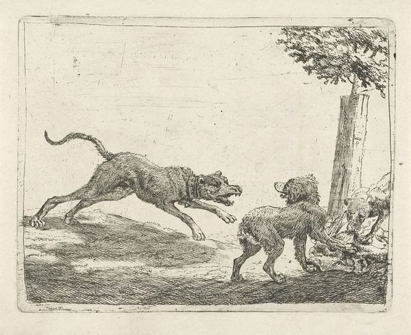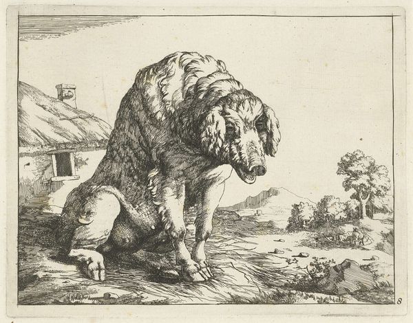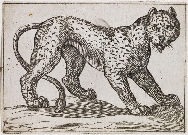 Richard Gaywood's etching, "Two Leopards and Three Wild Cats," presents a study in contrasts, composed around the textural interplay of light and shadow. Notice how the artist uses tightly-knit, fine lines to define the contours and patterns of the animals against the landscape. The composition invites an interesting dialogue, as each animal occupies its own distinct space, yet all converge to form a unified scene. The creatures lack traditional grace; their postures and expressions lean towards the grotesque, challenging classical notions of beauty and naturalism. Gaywood complicates our understanding of the natural world by incorporating elements that destabilize fixed meanings. The animals, rendered with such peculiar detail, serve as signs of a world that resists simple categorization, prompting us to reconsider our relationship with nature and representation. This etching, through its formal qualities, becomes more than just a depiction, but a profound exploration of the boundaries between the real and the represented.