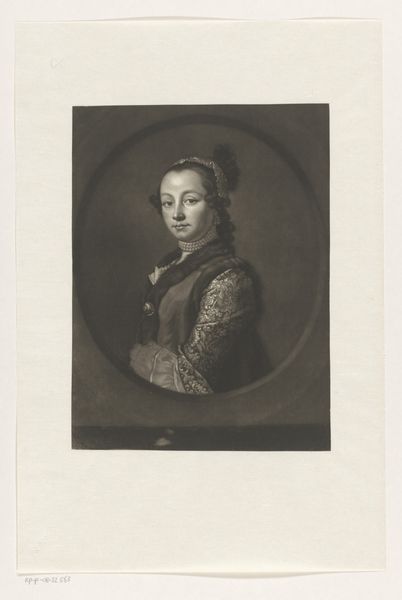 Curator: So, this is Achille Désiré Lefèvre's "Jeanne of Aragon, Vice-reine of Sicily," held here at the Harvard Art Museums. It just whispers elegance to me. Editor: There's a quiet formality to it, isn't there? The tonal range is quite restrained, focusing our attention on the sitter's serene expression. Curator: Yes, and there's something almost dreamlike about the way he captures her. I find myself wondering what she was really like as a person. Editor: The artist has skillfully used light to model her face, creating a soft, almost ethereal glow. Note how the dark background really pushes her forward. Curator: It's true. It makes her feel immediate, present. It's more than just a portrait; it feels like a quiet conversation across time. Editor: Indeed, Lefèvre's manipulation of light and shadow transforms a historical figure into an intimate, almost vulnerable presence. Intriguing.