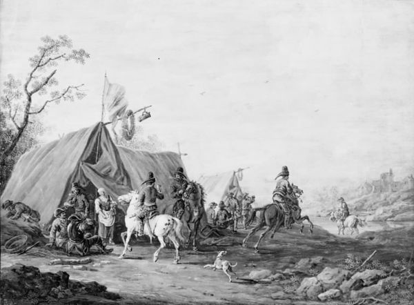 Curator: "A Camp," a canvas created between 1662 and 1733, by Jan van Huchtenburg. It resides here at the SMK, Statens Museum for Kunst. What do you make of it? Editor: Stark! The constrained palette and subdued brushwork give it a detached, almost ghostly atmosphere, yet I'm drawn to how those limited means capture such animated energy in the figures and landscape. Curator: Indeed. Huchtenburg was quite celebrated for his military scenes. His clientele certainly expected a certain glorification, shall we say, of military exploits during that era. Genre painting gained much support as an ideal vehicle. Editor: I wonder, though, about the actual labor embedded in its production. Where were these pigments sourced? How did Huchtenburg organize his workshop? His baroque-style brushstrokes were highly sought after but clearly show production value here, even at the time, this wasn't exactly meant for a pauper's dwelling. Curator: Good points. The patronage system significantly influenced the narrative depicted and who could enjoy it. Such battle scenes provided visual support for political narratives, reinforcing power structures and, in some cases, romanticizing conflicts. How else would those narratives survive? Editor: Precisely! And what of the canvas itself? Linen was typical. But what were the processes involved in preparing and stretching it? The materials dictate so much! Looking closer, the textures evoke the smells of oil, dust, and the sheer physical labor required to build such a vast landscape, if you think about it in real life... not really heroic, I mean… Curator: Well, "heroic" depends on your perspective, doesn't it? Nevertheless, the piece offers an insightful look into the public perception and justification of warfare. Editor: Perhaps the lasting legacy here is what remains tangible. Materials endure and testify to that original labor beyond any idealization. Curator: Yes, a reminder of the complicated history, far more than brushstrokes. Editor: Indeed, the canvas remembers even when our interpretations shift.