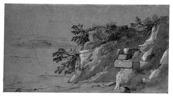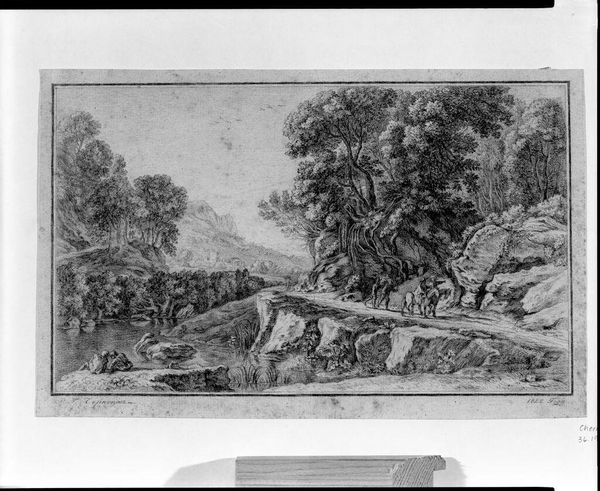 Editor: This is Ferdinand Kobell's "Landscape with Travellers," a pen and black ink drawing. The figures seem so small against the vast landscape. What do you see in this piece? Curator: I see a commentary on social stratification during Kobell's time. The travellers on foot and in carriages, juxtaposed with the seemingly idle figures in the foreground, hint at the disparities inherent in 18th-century society. How does the landscape itself contribute to this narrative? Editor: It feels indifferent, vast, and perhaps even a little isolating, regardless of social standing. Curator: Precisely. Nature, rendered in meticulous detail, becomes a stage upon which these social dynamics play out. Kobell seems to be asking us to consider the role of environment in shaping and reflecting these power structures. Editor: It's fascinating to consider landscape as a site of social commentary! Curator: Indeed, and it prompts us to think critically about how artists can use seemingly benign subjects to address complex social issues.