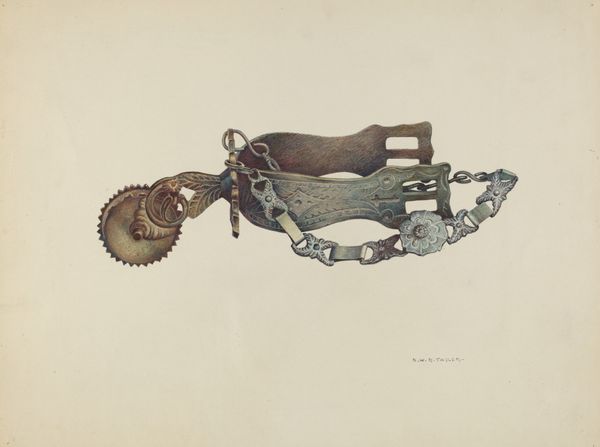 Curator: Ah, the smell of old metal and untold stories. It always gets me. Editor: Well, the "Bar Bit" by Rose Campbell-Gerke, probably done sometime between 1935 and 1942, certainly has a weight to it. Is this piece rendered in watercolor? Curator: It looks like it. There are lovely, delicate lines describing something that is really quite brutal, when you think about it. Editor: Brutal because of its function, absolutely. As a drawing, I wonder about the function of depicting this object in the 1930s. Watercolor elevates something purely functional into the realm of art and domestic display. Curator: Yes, the juxtaposition. And consider the detail in the rust, the wear! The artist really dwelt on those elements, almost as if she's giving it a sort of… portrait treatment? It almost transcends its original purpose. Editor: Indeed, you are right! By rendering an object so loaded with material reality in watercolor, the artist is commenting on labor and the history embedded in this very ordinary object. Curator: Absolutely, and even perhaps our relationship with objects—we control them, they control us. Thinking of the horse forced to carry this bit. Editor: Well, certainly this specific tool allowed a more acute communication between a rider and their horse. One could almost describe it as a haptic technology. Curator: Haptic, that's clever. I am reminded also how it changes through its age, each scrape or wear represents work. Editor: Yes, and consider how commonplace horse tack was during its time. The drawing turns this into something to be studied and perhaps cherished? That broken link, now just ornamental… Curator: Leaving us with so many questions, isn't it? Still, what stays with me is the patience it must have taken to render these ordinary objects in watercolor, to lift this worn-out old metal object out of the muck and mire. Editor: Agreed. Campbell-Gerke prompts us to contemplate not just use, but also a history and transformation revealed in such subtle rendering and a close attention to the materials from which it's built.