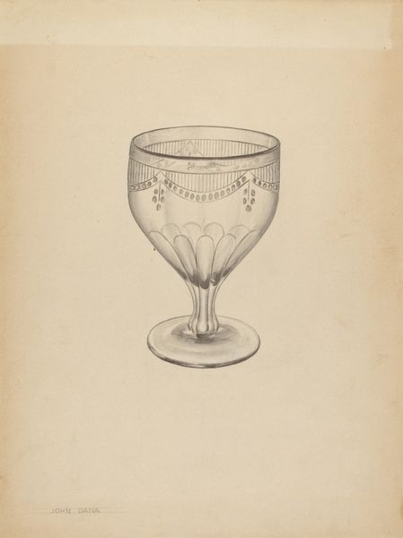Curator: Welcome. Here we see a pencil drawing entitled "Goblet," created around 1938 by Edward White. Editor: At first glance, it feels so serene, almost like a meditative exercise in rendering light and shadow. There's a quietness, a stillness, that makes me want to pause and breathe. Curator: It is quite meticulously crafted. White has taken a very common, everyday object and elevated it, immortalizing it in a way. Do you notice anything specific about the goblet itself? Editor: Well, there's something fascinating about the inclusion of what appears to be an etched fern inside. It makes you wonder what stories that glass could tell, who might have raised it in a toast. Also, these faint black specks scattered across the background add an extra layer of depth... I feel like I'm stargazing while staring at the glass, you know? Curator: An intriguing observation. Edward White was actively working at the Bausch and Lomb Optical Company around this time. He eventually became head of the company's illustration department. This technical background likely explains the precision in his depiction here. Think about his day job showing off lenses through advertising - in the public eye - that he applied so rigorously in private too. Editor: So it’s almost like he’s showcasing his own lens here - what an idea! I'm getting a sense for his deep satisfaction, almost a kind of glee, in understanding and recreating something of such complexity with just his pencils. I find the simple things sometimes the best: this has turned me on my head in many different directions, it feels limitless. Curator: Indeed, and it reveals a side to White, removed from the pressures and obligations of the corporate marketing strategies of his job, doesn’t it? Editor: Absolutely, I leave having gained so much from something that once felt to me very small, or quiet.