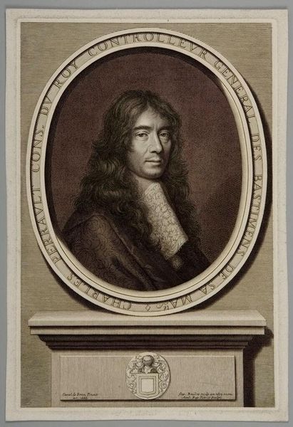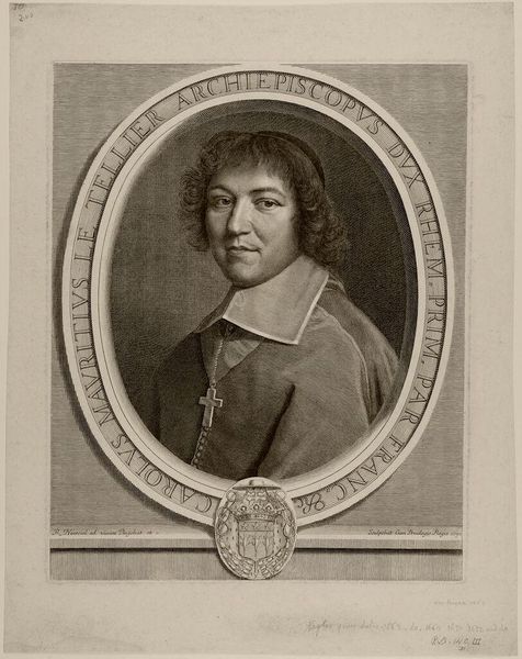 Curator: The light seems to be emanating from within him, doesn’t it? Editor: Indeed. This engraving, "Jacques-Nicolas Colbert" by Robert Nanteuil, is striking. Look at the textures, the weight of the cloth suggested by simple lines. Curator: Nanteuil truly captures something essential in Colbert’s gaze. The Celtic knots surrounding the portrait feel like echoes of ancient wisdom, framing him in a lineage of contemplation. Editor: It’s also a clever play with social status. Notice the fine detail on the cleric's garb? This was a demonstration of both Nanteuil's skill and Colbert's wealth. Curator: Wealth, yes, but also position. Colbert's collar, the fall of his hair—signifiers of a life devoted to both spiritual and temporal power. The symbols around the frame seem to reinforce a sense of timeless authority. Editor: Maybe. But what of the tools and labor involved in its creation? It's the process of engraving that enabled this image to circulate, spreading Colbert's influence far beyond the court. Curator: Point taken. Still, I see something deeper in the expression, a hint of the burden of leadership, reflected in those knowing eyes. Editor: A skillfully constructed image, no doubt, laden with meaning and material presence. Curator: Precisely. It’s fascinating how these symbols still resonate centuries later.