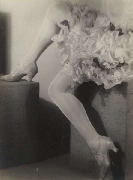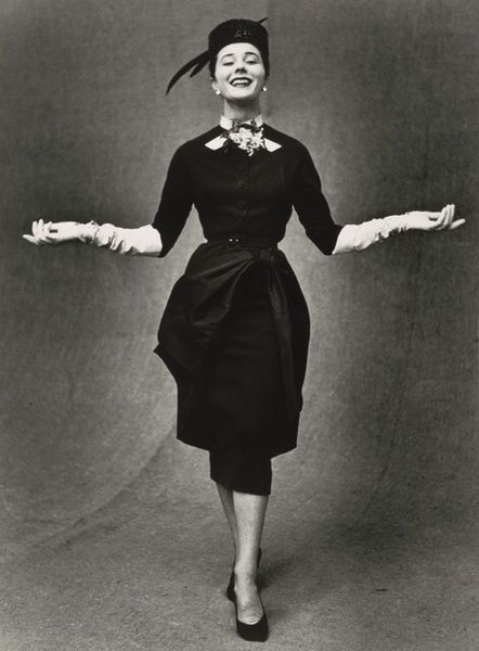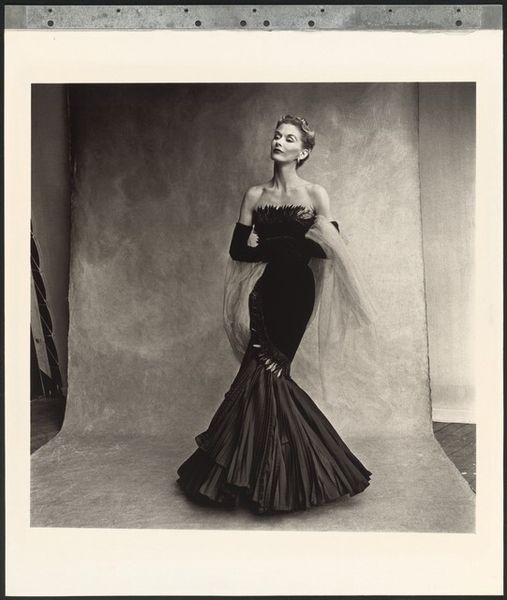This is "Woman with Roses (Lisa Fonssagrives-Penn in Lafaurie Dress), Paris," a photograph of elegant formalism by Irving Penn. The photograph's composition centres on the interplay between light and shadow, which articulates form and enhances texture. Penn uses a monochromatic palette to emphasize the interplay of geometric forms and textures. The model's figure is sculpted by light, creating a dynamic sense of volume within the two-dimensional space. The dress's structured fabric contrasts with the soft, organic shapes of the roses, suggesting a dialogue between nature and artifice. Penn's construction invites us to see how fashion photography can transcend its commercial purpose. The subject’s expression and pose, combined with the meticulously arranged elements, create a sense of controlled elegance. The photograph prompts us to reconsider established notions of beauty and representation within fashion. In this way, Penn challenges fixed meanings in visual culture, engaging with new ways of thinking about perception and representation.