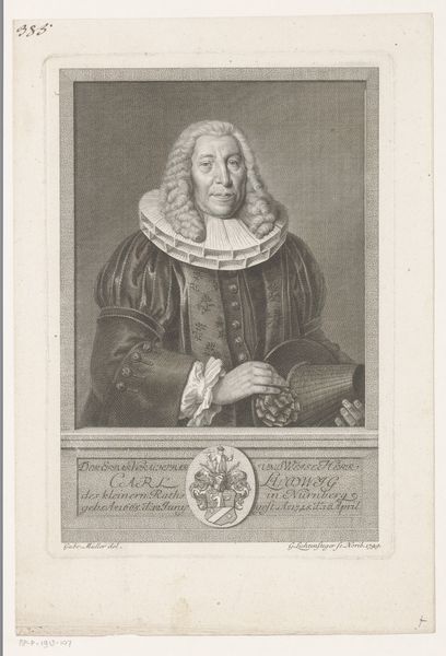 Curator: Here we have a print titled "Portret van Johann Julius Struve," created in 1748. It's currently held in the Rijksmuseum. What strikes you about it initially? Editor: The level of detail achieved with engraving is remarkable, and how it allows such precise delineation of texture, in both the face and the ornateness of the oval framing it. But the mood...melancholy? There is something both stern and kindly in the Reverend Struve's presentation. Curator: Well, Schleuen, the artist, aimed to present Struve within a very specific cultural context. As a prominent theologian and a preacher in Magdeburg, his vestments, bearing, and the very inscription beneath the portrait all work together to solidify his status. What's particularly interesting is that, because the prints could be replicated cheaply, these portraits functioned as both honorific and propaganda pieces of sorts for the church and the individuals depicted. Editor: The semiotic construction is clever. The use of Latin in the cartouche at the base suggests not only Struve's intellect but also signals to a learned, elite audience, further enhancing the perception of prestige. And that gesture of his hand! It feels like an oratorical pose, mid-sermon maybe, as he seeks to drive home his point with measured calm. The light is positioned so it brings out this expression while also calling attention to the wig. Curator: Precisely! Think about the laborious work, and the cost that would entail to emulate this hair with one's natural locks! These pieces reinforce notions of class. The labour involved in producing this print—the time invested in such painstaking detail with such expensive materials, contributes to the glorification not just of Struve, but of the social order itself. And by owning the prints you take a place in this network. Editor: Absolutely. And to close, observing the use of shading, notice how strategically it's deployed to add volume, to guide the eye towards Struve’s face, to highlight specific textual elements...It elevates the artwork to be more than just informative to something subtly affecting. Curator: Indeed, and when we look at how engravings circulated so widely in the 18th century, portraying not just elites but all types of people at different socio-economic status, these types of prints act as markers of identity and of social cohesion.