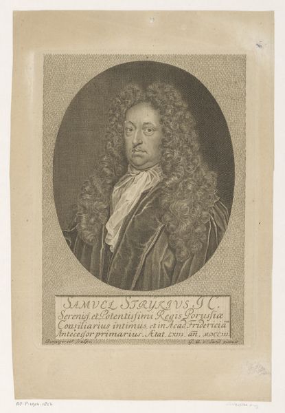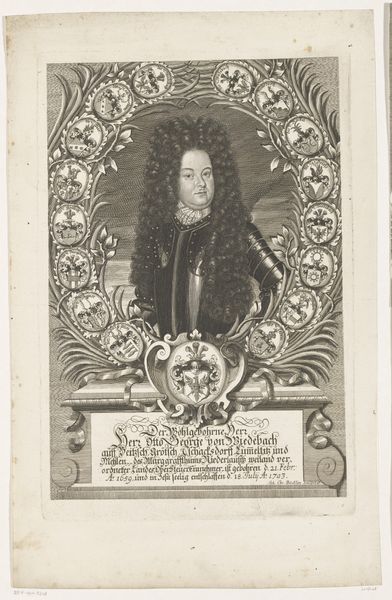 Curator: The piece before us, residing here at the Rijksmuseum, is an engraving from 1689 titled "Portret van Willem III, prins van Oranje." It's by an anonymous artist. Editor: It strikes me as instantly imposing—the tight framing of the oval portrait, that ornate, leafy border. And the light! The high contrast pulls William forward, doesn’t it? Curator: Indeed. William's position as both Prince of Orange and King of England, Scotland, and Ireland profoundly shaped the political landscape of Europe. To consider the Glorious Revolution— the power dynamics that deposed a monarch, solidified parliamentary sovereignty, and impacted the rights of religious minorities – William's identity as a protestant king invited a wave of complicated issues, of allegiance and freedom. How does the presentation speak to those tensions, would you say? Editor: Well, looking at the execution... the meticulous details of the wig and lace. There is an undeniable sense of formality, even stiffness, which contrasts, I think, with what might be understood about his military campaigns, and what some might understand as acts of valor. Do the embellishments here obscure those more personal qualities? Or recontextualize it for a more staid audience? Curator: These state portraits are rarely simply objective records. Consider, that this was likely produced and widely disseminated during his reign—in that moment, such imagery acted as strategic propaganda. To create an image, for those newly governed, of strength, resolve, divine right, and power. Editor: Absolutely. The text beneath the portrait adds to that sense of grandiosity, shortening "William" to the imperial, latinized CVILELMVS—and adding "...etc., etc., etc." to imply a host of other titles that it cannot fully list. Curator: Beyond that, the use of printing, as a medium—to your point about it reaching new audiences—is inherently critical. Here it’s vital. It reinforces not just visual authority, but accessibility. What we see, I think, speaks volumes about constructing an identity as something to be consumed en masse, a proto version of virality, if you like. Editor: Fascinating how even the smallest detail— the Latin, the abbreviations, the embellishments— contributes to the carefully crafted impression that resonates even now. It reminds us of the power of image, and of our present-day obligations to interpret it through historical lenses. Curator: Yes. The context gives incredible shape to even a traditional print. It shows how social status can both emerge from an artwork and give it significance.