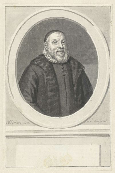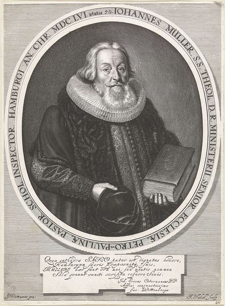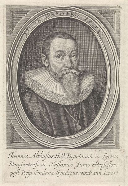 Editor: This is "Portret van theoloog Johannes Maccovius," made in 1644 by Cornelis van Dalen I. It's an engraving, so ink on paper. What strikes me most is the intricate line work and the framing oval around the subject, but what details jump out to you? Curator: I find the rigorous construction of this piece noteworthy. Consider how the artist establishes rhythm: the repeating forms of the lettering against the framing border echo the pleated ruff. This visual parallelism implies an association between the sitter's identity and the attributes conferred upon him by his academic credentials. Notice, too, how the lines operate as tonal modeling as they coalesce to denote areas of shadow across the planes of the face. The figure's expression appears to result directly from the considered interplay of darkness and light. Does this register with you? Editor: Absolutely! It's almost as if the subject's character is being constructed before our very eyes, through light and shadow. How would you interpret the Latin text inscribed around the portrait? Curator: Indeed, it underscores the sitter's virtues and learning. Its inclusion emphasizes the symbolic dimension of the piece as it serves as a pictorial declaration of the sitter’s moral and intellectual status. Observe also that this declaration exists independently of—though surely related to—any historical insight it might lend us regarding its ostensible subject. Editor: That's a great way to consider how formal elements contribute meaning! Thank you for highlighting the interplay of image and text and their symbolic resonance. Curator: My pleasure. Focusing on its formal qualities opens the piece to different interpretive avenues and enhances one’s engagement.