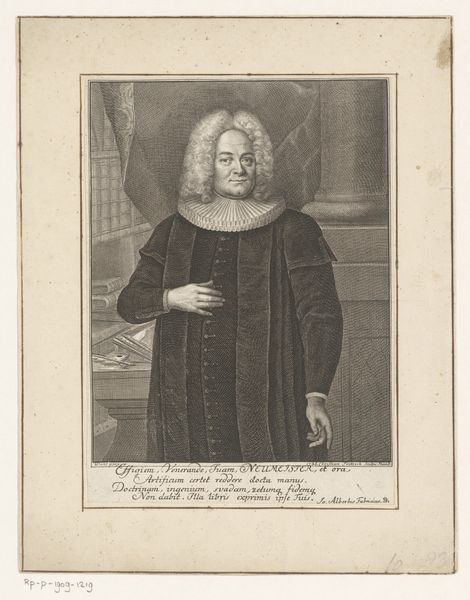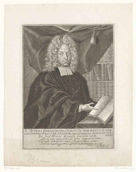 This is a portrait of Johann Friedrich Mayer, made by Johann Georg Mentzel, likely sometime in the early 18th century. Mayer was a figure of some standing, as the inscription tells us, holding positions in the church and in academia. This print, made in Germany, offers a fascinating glimpse into the way status was projected in the late Baroque period. Mayer is dressed in the dark robes of his office, and his voluminous wig and elaborate collar mark him as a man of substance. He gestures towards an open book, alluding to his learning and piety. Behind him, a curtain and a shelf of books create a suitably impressive backdrop. To understand this image, we might delve into the archives of the institutions Mayer was associated with, piecing together the social and religious context in which he lived and worked. By situating this portrait within its historical moment, we can begin to understand the values and aspirations of the society that produced it.
