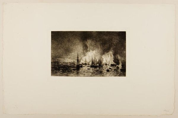 Editor: This print, made by Johan Conrad Greive in 1876, depicts "The Burning of the Customs Houses on November 15, 1813 in Amsterdam". It’s such a dark scene, emphasizing the texture of smoke and suggesting a volatile atmosphere. What can you tell me about it? Curator: Well, let’s consider the historical moment captured. What’s being burned? Not just wood, but a symbol of imposed governance, and very concretely, customs *houses*. Who benefits from their destruction? Consider Amsterdam's position at the time and who controls trade and its material advantages. Editor: So, thinking about it materially, burning customs houses is a very active removal of a structure controlling trade…a literal destruction of a system. How would the materials have informed the reading of this piece by contemporary viewers? Curator: Exactly. The Dutch economy was suffocating under French rule and its imposed tariffs. The burning isn’t just symbolic, it is about wresting back control of resources and wealth. The choice of print as the medium, too, allows for a wide dissemination of this act, reinforcing its significance. Where does value lie here? Editor: I see your point. It's not just a depiction of a historical event, but a material act of defiance circulated for further reinforcement. The act itself changes the material conditions. It becomes propaganda through production! Curator: Precisely. And what materials were used in the printing process? How accessible was this process and artwork to different classes of society at that time, considering materiality? Editor: It gives a new dimension to see it as an instigator of change through materiality! Thanks, I’ll definitely reflect on that further. Curator: Glad to have given you some food for thought. Consider further the labor involved!