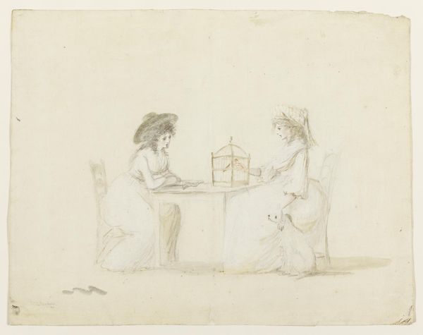 Curator: Here we have Thomas Rowlandson's watercolor, "Two Women Sewing by Candlelight," held in the Tate Collection. The warmth of the candle seems to emanate right off the page. Editor: Immediately, I'm drawn to the intimacy of the scene. The textures of their bonnets, the very labor of mending... it all speaks to the domestic sphere and the repetitive nature of women's work in this era. Curator: Precisely! The softness of the watercolor lends a dreamy, almost nostalgic quality, don't you think? It's as if we're peeking into a private moment, a shared space of quiet industry. Editor: Watercolor was perfect for the accessible print market, enabling mass reproduction of images that offered a glimpse into fashionable life for those who consumed art and material culture. Curator: There is a certain gentleness and intimacy. Rowlandson captures the subtle light so beautifully; these women, they might be lost in thought. Editor: And think of the economics of candlelight itself! These weren't idle pursuits but were often necessities, ways these women could contribute to the household economy through mending, embellishing, or creating new fabrics. Curator: Yes, exactly! Rowlandson allows us a quiet moment of observation of these women and their work. Editor: It's a reminder that art isn't just about grand narratives, but also the quiet stories of everyday life and the labor that makes it possible.