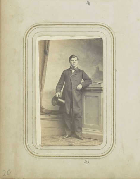 Curator: Here we have an example of early portrait photography by Alonso Martinez y Hermano, likely dating between 1850 and 1868. It's titled, "Portret van een staande jongeman met overjas," or, "Portrait of a standing young man with an overcoat." Editor: The muted sepia tones really give it a timeless, almost ghostly quality. Note how the textures, especially in the fabrics of his clothing and cape, are rendered with remarkable clarity. It seems almost staged, formal even. Curator: Exactly. Early photography served a specific social function, particularly for the middle and upper classes. It allowed families to capture their likeness in a way that painting traditionally did. Editor: The column detail also contributes to the sense of formality. It is clearly mimicking classic paintings and statues, providing visual structure but it almost feels like a cliché of classical portraiture. Curator: Right. The staging gives this photographic image an established air of respectability. Think of it as early PR, reinforcing ideals and solidifying one's social standing in a burgeoning society. Editor: The artist certainly creates an arresting study of the surface, texture and, above all, composition, but also the balance between the standing figure and supporting pillar. Note also the geometric harmony present between clothing, pose, and background detail, particularly within the golden rectangle established in photography. Curator: I think that by positioning his sitter against a classical column the artist borrows its connotations of permanence and education in a new way: by giving it to this new form of representation, Photography, and by letting the model borrow from it. What does this suggest about photography in the cultural context? Editor: You're right. We can read the figure itself in multiple ways. It seems that even the choice of his garment helps define the artist´s purpose. Curator: I see photography used at that time and that moment as a powerful social statement, a means for projecting a desired persona but here perhaps for constructing it. Editor: Very interesting; considering its textures, composition, and subtle play of light and shadow, I keep viewing it on its surface quality. Thanks! Curator: Likewise. The convergence of the social and artistic here opens many new avenues to explore in that particular moment.
