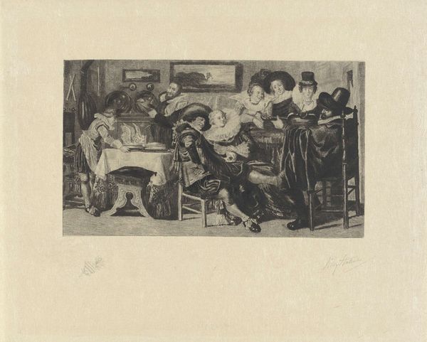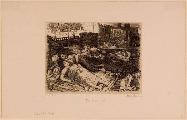 Editor: Here we have John Sloan's "Hell Hole," an etching teeming with figures. There's a palpable sense of boisterous energy, almost claustrophobic. What do you make of this scene? Curator: It's a slice of early 20th-century social life, a gritty realism. Sloan, with his Ashcan aesthetic, wasn't afraid to depict the everyday, the unvarnished. The density, the overlapping figures... it's like a visual cacophony, isn't it? Editor: It is! I see both chaos and a certain camaraderie. Curator: Exactly! Did Sloan idealize it? Perhaps not. But he captured a vital, raw humanity. It’s a world away from the polite society portraits of the time, isn't it? Editor: Definitely food for thought.