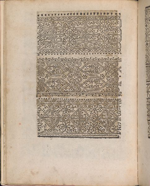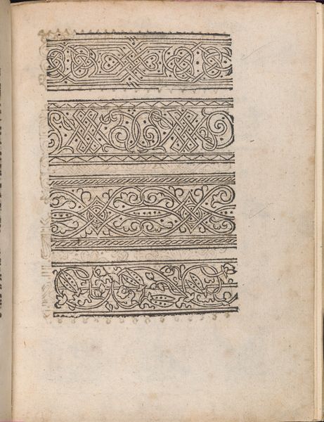 Curator: Looking at this, I immediately think: control, order, maybe even a subtle sense of confinement. The rigid borders seem to want to restrain the free-flowing patterns inside. Editor: I find that an interesting response. The piece we are looking at, "Modelbuch aller Art Nehens vn Stickens (Page 3v)," dates back to 1535. It’s attributed to Christian Egenolff and is currently housed at the Metropolitan Museum of Art. As a woodcut print and drawing, it reflects the socio-cultural emphasis of the period when pattern books held immense value. Curator: That’s the backdrop then; how pattern books served this specific, quite limited societal function? Do we know what they represented beyond simply "patterns" in the cultural psyche? Editor: They were incredibly important for artisans. Before widespread literacy and the internet of course, these books democratized design. They disseminated styles and techniques, fostering a shared visual language. This particular page illustrates bands intended for sewing and embroidery. It demonstrates the transmission of designs and skills within craft guilds, particularly affecting women's work, as textiles were essential in displaying status and wealth. Curator: So they functioned as these quiet revolutionary tools, and within gendered roles—and those roles certainly contained social power dynamics. When I view them that way, suddenly my initial response feels superficial. Seeing these now as almost subversive templates makes the piece much more interesting and far from conformist. Editor: The choice of a woodcut too is pertinent, the material dictates certain stylistic choices that speak to the practicality and affordability of the prints. These aren't luxurious designs; they were workaday tools that played a part in the socio-economic fabric. These were functional objects mediating larger dialogues between skill, status, and artistic dissemination. Curator: Absolutely, it reframes our reading. These patterns acted as silent participants in dialogues around access, gendered labor, and economic mobility of these artisans. It definitely brings new context and life to this old page. Editor: Indeed. Studying this allows one to think about how we archive collective expression within crafts, beyond individual attribution. Curator: That is precisely the role and challenge facing us when curating materials today. It has been eye opening!