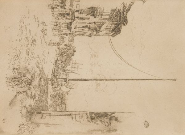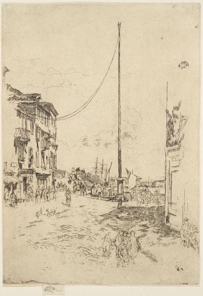 Editor: This is "The Mast" by James Abbott McNeill Whistler, and it is a print. I'm really drawn to the snapshot-like composition and how it captures a sense of everyday life. What stands out to you about this print? Curator: Well, considering Whistler's interest in Japonisme, this piece reflects his approach to modern art by capturing fleeting moments in urban environments, influenced by Japanese Ukiyo-e prints. How does this etching contribute to our understanding of the relationship between art and public life during Whistler's time? Editor: That makes sense. I can definitely see that influence now. Curator: The choice to depict an ordinary scene in Venice elevates the everyday. Whistler was known for seeking beauty in commonplace subjects. What does this suggest about the role of art in shaping public perception and appreciation? Editor: I guess he wanted to show that art doesn't have to be about grand things to be meaningful. Curator: Precisely. He's suggesting that the politics of imagery can be found even in the simplest scenes. It challenges the traditional hierarchies of art and highlights the value of lived experience. Editor: That's a really insightful way to look at it. Thanks! Curator: My pleasure. It's important to consider how artists like Whistler expanded the boundaries of art.