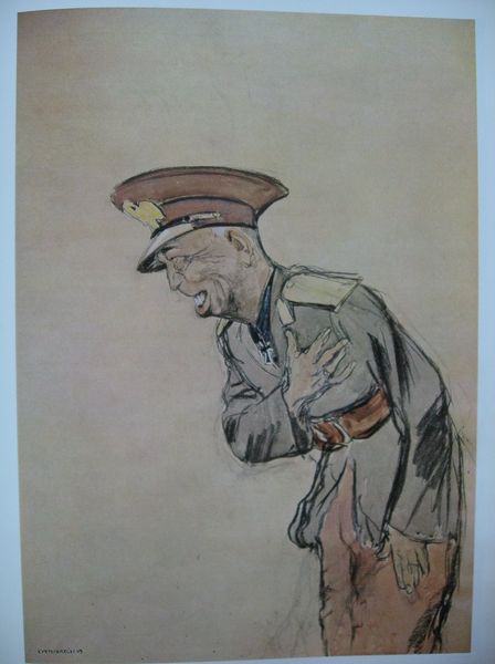 This untitled caricature of Adolf Hitler was created by the Soviet artistic collective Kukryniksy, active from around 1924 to 1957. The group formed in the politically charged atmosphere after the Russian Revolution, where art was seen as a tool for social and political change. Their satirical drawings often targeted enemies of the Soviet Union, and particularly, the fascist regime of Nazi Germany. Here, Hitler is depicted in a moment of hysteric rage, his features exaggerated to appear maniacal. The swastika on his arm is clearly visible, a symbol of hate and destruction. The artists use caricature not only to mock Hitler's persona, but also to diminish his power. As artists working under a totalitarian regime, Kukryniksy faced the challenge of creating art that adhered to socialist realism. Yet, they used satire as a powerful form of resistance, reflecting a collective desire for peace. Their work reminds us of art’s capacity to confront oppressive regimes and to shape public opinion.