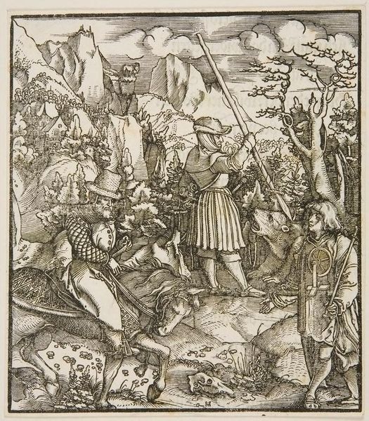 Editor: So, this is Lucas Cranach the Elder's "Saint Peter," at the Harvard Art Museums. It feels... crowded and intense. What strikes you about the composition? Curator: The composition orchestrates a tension between the individual and the collective. The figure of Saint Peter is decentered, almost overwhelmed by the throng. Note the lines, how they converge and diverge, creating spatial ambiguity and directing the gaze. Editor: Ambiguity? I see the figures clearly enough. Curator: Yes, but consider the receding planes and overlapping forms. Does the space truly resolve? It's the deliberate disruption of spatial logic that elevates the scene beyond mere representation. It compels us to question the nature of perception itself. Editor: I see that now. It's not just a story, but a constructed visual experience. Curator: Precisely. The artist uses form to challenge our assumptions about seeing. The intensity in the composition reflects the cruelty of the story.