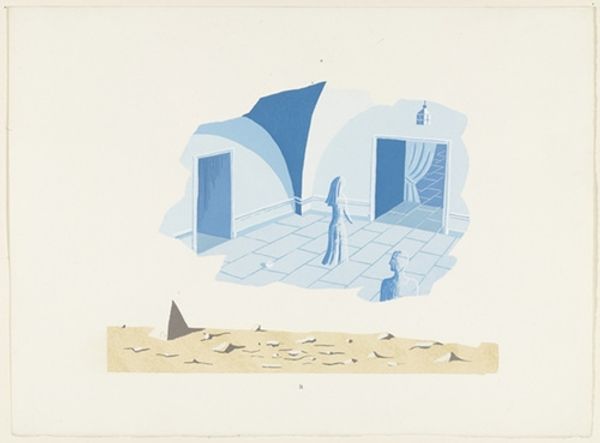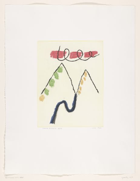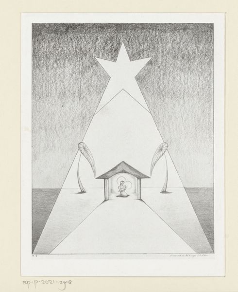 Curator: Harrie A. Gerritz's 1975 etching, "Meesterwerkjes van de Natuur," which translates to "Masterpieces of Nature," invites a curious look. It’s a modernist landscape, abstracted and printed with remarkable precision. Editor: My first thought is…isolation. Despite the title suggesting masterpieces, there's something barren, almost unsettling about this scene. Geometric forms sit starkly against the soft landscape. It evokes questions of human impact on nature, that contrast feels so strong. Curator: Exactly. See how Gerritz plays with geometry versus organic forms? The triangles offer a man-made feel while contrasting with the implied horizon, sky, and organic rocks. Note the precision etching lends an almost scientific quality, cataloging nature. The etching style is significant, calling back the scientific explorations, in a very modern lens. Editor: Interesting point about cataloging. To me, the almost clinical arrangement reads as commentary. Are we, in our pursuit of understanding and control, dissecting the natural world, leaving behind these isolated remnants? Is there a post-colonial undertone in deconstructing nature? Curator: It could be, the sparseness lends itself to an open ended discussion. The symbol of the rock throughout time indicates a connection to permanence, memory, and cultural signifiers. Consider also the etching process; a rigorous translation, a slow and studied process, mimicking the slow geologic timescales that create these forms. Editor: Yes, there is an interweaving there that cannot be denied! It invites a deep contemplation on how humanity perceives nature. Not as a nurturing home but, instead, deconstructing it into consumable and graspable fragments, to grasp at… understanding. It leaves me deeply uneasy, though. Curator: Unease isn’t necessarily a negative experience for art. Gerritz is questioning our perception of the natural world. Editor: Questioning is the work of progress, but it invites, also, personal reflection and cultural change in an active role, in nature’s defense. Curator: Very well, and thank you for this insight. Editor: And to you, this was most useful.