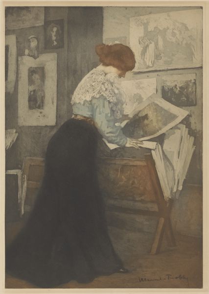 Editor: This watercolor piece, "Brieflezende vrouw," or "Woman Reading a Letter," is attributed to Frans Everbag and thought to be painted between 1903 and 1915. The scene feels so intimate, like a captured moment of quiet contemplation. I'm curious about the significance of everyday scenes like this during that time. How would you interpret this work? Curator: It's fascinating to consider this piece through the lens of its social context. Genre paintings like this one became popular as a way to represent the everyday lives of ordinary people, which, in turn, started gaining increased social relevance. What kind of woman do you think is portrayed? Editor: I think she seems like someone from the middle class, with a degree of literacy and access to private correspondence. Does the painting suggest something about women's roles during that period? Curator: Precisely. Consider the growing literacy among women and the expanding opportunities for communication. Letter writing became a crucial aspect of social and familial bonds. Images of women reading and writing also suggested a growing level of independence, albeit often within the confines of the domestic sphere. The presence of a detailed map in the background is noteworthy. What does that symbol tell us, then? Editor: Maybe the map behind her points towards global connections through trade, immigration, or colonialism. Curator: Exactly! These genre paintings were tools through which the rising mercantile class promoted and examined their values in domestic imagery. How did institutions enable the expansion of genre art to larger audiences at the time? Editor: That is very insightful! It definitely makes me consider how art reflects and influences society. Curator: Agreed, seeing this piece helps highlight the fascinating interplay between art, history, and societal development.
