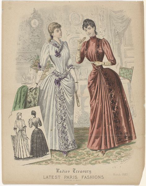 This is an 1882 edition of "La Mode Illustrée, Journal de la Famille," published by Firmin-Didot & Cie. As a fashion plate, it reflects the aspirations and constraints of bourgeois femininity in late 19th-century France. Note the elaborate construction of the dresses, which speaks to the era's emphasis on ornamentation and display. But more than mere aesthetics, these garments embody the complex social codes of the time, particularly around gender and class. Consider the female body as a site of both confinement and performance, where clothing dictated movement and behavior in public and private spheres. These images were circulated widely, shaping perceptions and desires and reinforcing the notion of women as objects of beauty and consumption. Despite their seemingly frivolous nature, fashion plates offer invaluable insights into the cultural landscape, revealing the intimate relationship between personal identity and societal expectations. How do these images make you feel about the constraints placed on women during this period?
