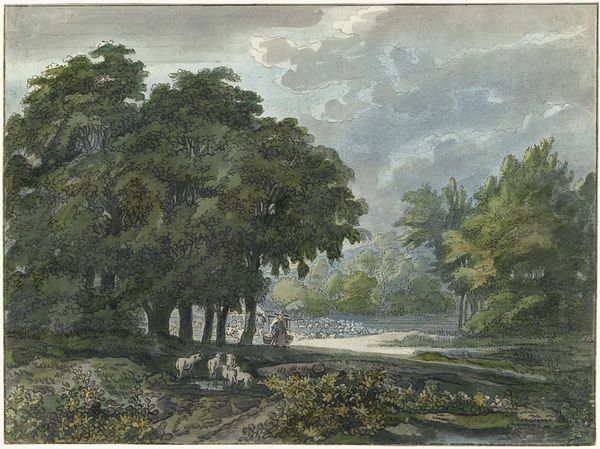Editor: So, this is Matthijs Maris' "Boslandschap met watervalletje," likely painted sometime between 1849 and 1917, held here at the Rijksmuseum. It's watercolor, and right away, I'm struck by how dreamlike and soft it feels. Everything is sort of hazy. What do you make of that mood? Curator: Hazy is spot on. It feels like a memory, doesn’t it? Maris was part of a generation wrestling with new ways of seeing the world – trying to capture fleeting impressions, not just photographic realism. That soft focus almost whispers a secret about the transient nature of beauty. It invites you to feel, more than just observe, this 'forest landscape with a small waterfall.' Tell me, what pulls you in most about it? Editor: Maybe the figures in the background? They’re so small, almost swallowed by the landscape, yet they add a narrative element. Like, who are they? Where are they going? Curator: Exactly! They're not the focus, are they? Just part of the living, breathing scenery. Maris isn’t presenting us with a grand history painting, but a shared moment, a human connection with nature. Look how the light catches the trees – that shimmer. It almost vibrates with life, wouldn’t you agree? Almost like music transposed to canvas. And did you see, hidden beneath the washes of colour are suggestions of coloured pencil that support and refine forms within this landscape scene. It's so clever. Editor: I see what you mean! It’s like the painting is alive. I never thought about landscape being able to evoke that feeling. Curator: Landscape, especially as handled by Maris, is never *just* about pretty scenery, is it? It’s about feeling, about mood, about suggesting something beyond what we see. Perhaps even hinting at a world that lives both within and beyond us all. Editor: That makes me look at it completely differently. Thank you!