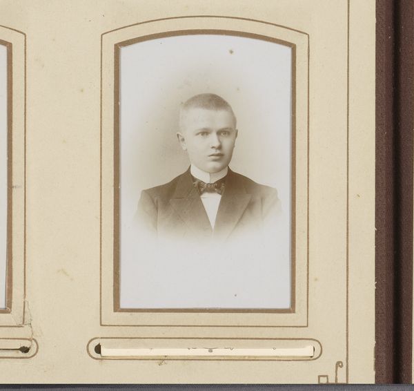 Curator: This is "Portret van een man," or "Portrait of a Man," a photograph created sometime between 1880 and 1910 by Atelier J. Fuchs. Editor: There’s an undeniable solemnity here. The man's gaze is so direct, almost piercing, but softened by the monochrome palette. I sense a weight of expectation, or perhaps responsibility, etched into his features. Curator: Considering its period, the photograph likely involved significant labor in its production. From preparing the chemicals for the emulsion, meticulously posing the subject, to the printing and development processes, photography at this time was a craft demanding patience and precision. The finished product would have held significant material and sentimental value. Editor: Yes, the very act of commissioning a portrait like this speaks volumes. The crisp white collar, the dark jacket—these are not just clothes; they're signifiers. They suggest a certain social standing, a desire for posterity. It’s interesting how clothing became such an important social tool. Curator: The social aspect is key. This wouldn't have been mass-produced in the way we think of photography today. It's likely a carefully considered representation for a specific audience, perhaps family, potential partners, or professional peers. Think of it within the context of broader economic shifts; increased wealth among the middle classes enabled access to such services. Editor: And there's something timeless in those eyes. That same desire to be remembered, to leave a mark, is universal. I also notice the faint writing in the border of the piece that's somewhat abstracted, could it point towards an implicit social or cultural relationship between artist and subject? Curator: It is certainly food for thought, given this image as object provides very little further insight. Editor: Precisely. These portraits offer an enduring glimpse into human emotions and motivations across generations. The symbolism may shift, but the essence remains. Curator: Indeed. Examining it materially reminds us how photography transformed not just artistic expression but also the construction and dissemination of identities during that era. Editor: A somber photograph, prompting consideration of labor, legacy and personal significance, don't you think? Curator: Absolutely. It speaks to the material conditions and aspirations of its time, giving a rich understanding of personhood within it.