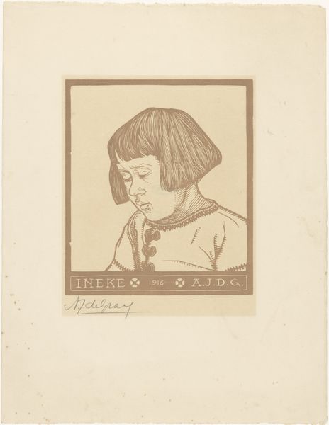 Editor: Here we have Lodewijk Schelfhout's "Andreas I," created in 1916. It’s an etching, and its delicate lines give the subject such a pensive, almost melancholic air. What symbols or deeper meanings do you see in this portrait? Curator: That melancholic air, as you describe it, is key. Notice how the child’s eyes are closed, face turned inward. This posture speaks to a psychological interiority, a world of private emotions, accentuated by the period. Remember, 1916 was the height of World War I. Editor: So, could this be a representation of the innocence lost during that era? Curator: Precisely! Children frequently become symbols of vulnerability during wartime. The downcast gaze is not just an individual expression; it embodies a collective grief, a silent acknowledgement of suffering during the war, reflecting cultural memory. The child's physical features verge on caricature, emphasizing vulnerability, wouldn’t you agree? Editor: I see that now! And it looks like the medium adds another layer— the fragile lines of the etching, mirroring the delicate state of childhood and perhaps society. Curator: The choice of etching, intaglio, enhances that sense of delicacy but also conveys a feeling of something etched in time, like a memory permanently marked. Are there are any repeating elements, textures, or objects, or overall tones that stick out to you? Editor: It definitely is a lot to unpack, this blend of personal feeling and the larger world events. Thank you! Curator: A poignant piece, reminding us how individual emotions become powerful symbols reflecting historical anxieties. We've seen the emotional power contained in such works and how they gain cultural weight and meaning across generations.