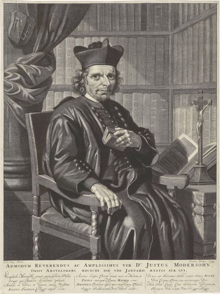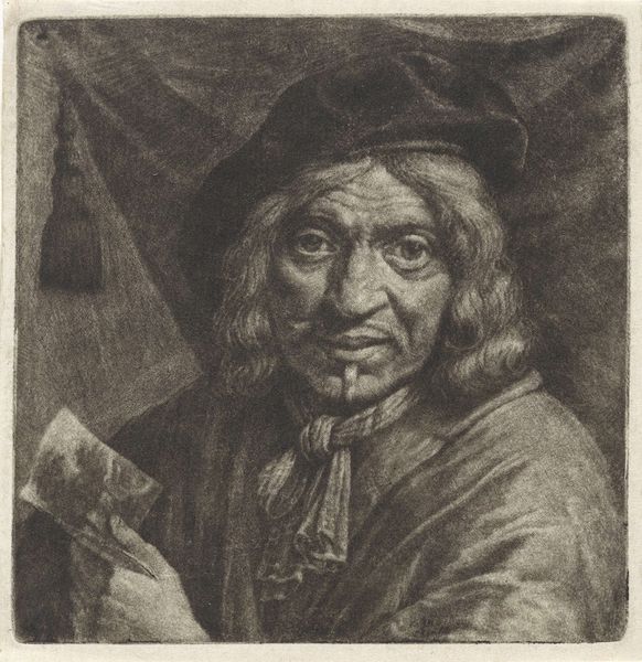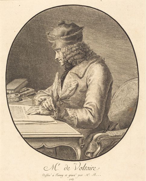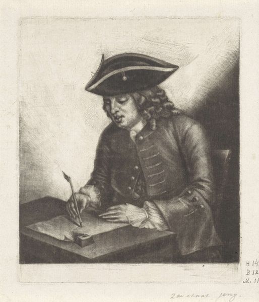 Curator: John Greenwood's portrait of Michiel Elgersma, dating from around 1759 to 1760, presents a rather contemplative scene. The piece is an engraving, showcasing the artist's mastery of line and tone. What's your first impression? Editor: It's all about the textures, isn't it? The meticulous hatching, building density where shadow falls. It gives the composition a weight, a tangible presence. There's also something so intimate about the composition – close in on this figure immersed in his work. Curator: The very act of writing was deeply symbolic. Literacy was less widespread, and writing was powerful. Notice how Greenwood depicts Elgersma absorbed in the act; he becomes almost a conduit for ideas. The quill becomes an extension of the man. Editor: Agreed. The stark contrast isolates the subject; and that very gesture – the hand paused over the page, becomes freighted with meaning. It calls attention to the construction of knowledge, a poised moment of creation and articulation. Semiotically fascinating. Curator: Consider too his attire—the simple coat, the scholarly glasses perched on his nose, the somewhat casual hat. These elements speak to a very particular social role: the learned, engaged citizen. This image communicates much about class and identity of the time. Editor: Right, the way the composition leads your eye directly to the face, with that cascade of light, the carefully described features give the scene a sharp visual hierarchy. And the way the folds of his coat interact with the shadow, forming dynamic relations that contrast with the relative clarity elsewhere. Very clever formal design. Curator: Greenwood truly captures a certain kind of intellectual vitality here. Elgersma isn't merely posing; he's engaged. That’s where much of the emotive energy of the print originates for me. The moment captures so much in one, economical depiction. Editor: Yes, a very economical articulation that results in more than just the portrait of the individual but the portrait of ideas themselves in dynamic motion, something of a time capsule. I do see that reflected too.
