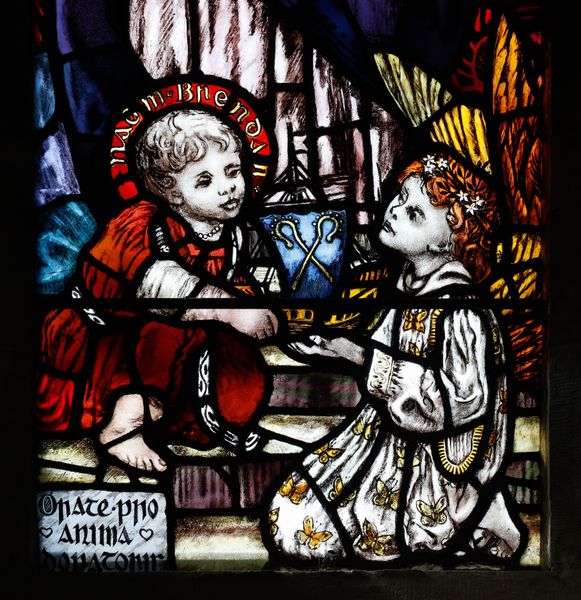 Curator: This stained-glass artwork, "Loughrea St. Brendan's Cathedral. Venite Adoremus in Bethlehem," created in 1908 by Sarah Purser, showcases a scene with deep colors and a clear medieval influence. It almost feels like a page taken straight out of an illuminated manuscript. How do you approach a piece so clearly connected to craftsmanship and its cultural moment? Editor: Well, what strikes me is the emphasis on the actual making of this piece. It is glass, a common material, yet made into something precious by craft. It’s not simply the visual narrative, but how that story is constructed, that feels most pertinent here. Does it challenge any notions of fine art, would you say? Curator: Precisely! Purser is explicitly engaging with labor here, both hers and that of the craftspeople involved. How does this work relate to the economic realities and consumption patterns of its time? Considering this was produced during the Irish Revival, what can the piece tell us about cultural production and the re-evaluation of indigenous crafts against industrial modes? Editor: That's a compelling point. Seeing it as part of the Irish Revival reframes it. The conscious revival of medieval styles and techniques becomes a political act. It’s not just pretty to look at; it speaks to economic self-determination, of the rediscovery and value of their traditional artistic labor against imported, industrialized goods. I had not considered this before! Curator: Consider the use of glass itself—it’s a fragile material, but rendered here as something permanent, a narrative frozen in time. And observe the contrast in details; look at the folds in fabric rendered alongside geometric decorative patterns in the window borders. What tensions might that suggest in terms of materiality and representation? Editor: The materiality, right, this isn’t simply representation but a literal constructing of meaning with earthly materials! So this glass isn't merely a canvas; its inherent properties become interwoven with the narrative. Now I feel I need to consider what is shown as inextricably linked to the medium employed and how it relates to cultural expression of this period.
