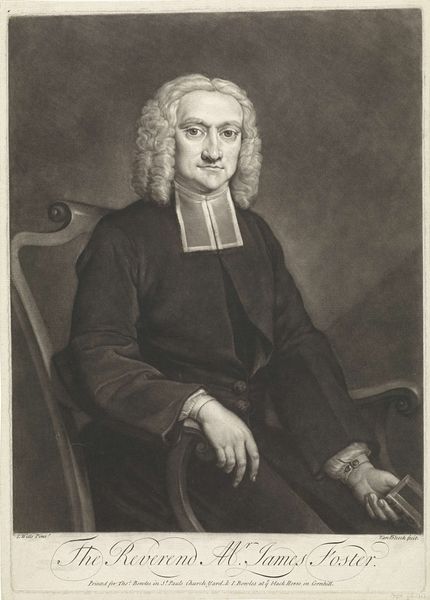 Curator: This portrait by George Romney depicts William Colman, who served as Master from 1778 to 1795. What's your first impression? Editor: Immediately, I sense a reserved, almost severe mood. The dark robe dominates, contrasted by the bright white wig. There's a real tension between these opposing forces. Curator: Indeed. The stark contrasts emphasize the dual nature of his role: the weight of office versus the individual beneath. Think about the symbolic weight of that robe. It signifies authority, tradition, but also perhaps a loss of individual identity within the institution. Editor: Precisely. The muted color palette and the formal pose, even the slight recession into shadow on the left side, reinforce this sense of restraint. Is he empowered or confined by this position, I wonder? What does it mean to see a portrait of a Master? Curator: The books barely visible in the background signify scholarship and learning, further grounding him in the context of academia and intellectual authority. It represents continuity but within very strict confines. Editor: But let's consider that uniform—I mean, wig. It performs a social function in that specific time period and, despite his power in his day-to-day life, is nonetheless subjugating, isn't it? A class-marker imposed upon a specific class and gender within a particular socioeconomic framework. Curator: That’s a valid point, and an uncomfortable fact that these powerful institutional roles relied so heavily on visible social signifiers and performative, ritualistic behaviors. Even something as simple as the clasped hands suggest composure but also hint at internalized pressure to perform, a necessary component of leadership. Editor: Thinking about these figures enshrined as portraits feels increasingly strange the more our understanding of systems of power shifts, doesn't it? But, ultimately, that contrast you pinpointed between institutional expectation and individual struggle still speaks across time, for sure. Curator: I find the work strangely compelling due to its ambiguous portrayal, ultimately a powerful meditation on the nature of public office. Editor: Agreed. Romney manages to pose questions that are still incredibly relevant now. It's definitely stayed with me.