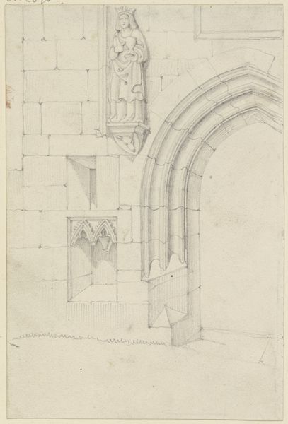 Curator: Hmm, immediately I feel like I've stepped into a quieter world, one filled with sharp lines and a kind of steadfast stillness. Editor: This is a drawing titled "Gothic portal" by Karl Ballenberger. Although we don't have a precise date for its creation, it comes to us from the 19th century and lives now in the collection of the Städel Museum. Ballenberger has rendered this architectural fragment with graphite, pencil, ink, all on paper. Curator: It's fascinating how much detail he packs into a seemingly simple subject. I feel like I could run my hand along those stones and feel the coolness. It’s all so… controlled. Almost a loving study of form itself, a gentle quest for definition. Editor: Absolutely, and it speaks volumes about the cultural fascination with the medieval era during the 1800s. Gothic architecture, with its soaring lines and religious undertones, became a powerful symbol for national identity and spiritual aspiration during a time of immense political and social change. Curator: A symbol searching for meaning, perhaps. Because here it is isolated; removed. We aren’t shown the towering cathedral or even a whole façade, but just this...entryway. It feels like he is holding it, examining it under glass. Editor: Indeed. The act of drawing itself, especially with such deliberate realism, can be interpreted as a form of preservation. Ballenberger isn't just depicting a gothic portal; he's immortalizing it, asserting its value within a rapidly modernizing world. We have to consider too the role of institutions such as museums, providing validation and enshrining buildings such as this one, imbuing its themes with added cultural significance. Curator: And in a way, we still do that, don’t we? I catch myself seeing these things less as history, but more of seeing reflections. Echoes of self that still call to me even today. A way back and forward all in one. Editor: Art really provides this amazing mirror across time, helping us investigate not only history, but what it can suggest about the trajectory of our future. Thanks for the look at this drawing. Curator: Of course, thank you.