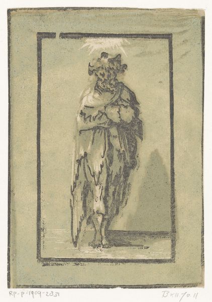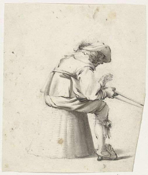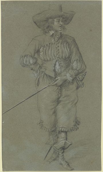 Jacob Weyer created this drawing of a standing cavalier in the mid-17th century using chalk on blue paper. Notice how the limited palette accentuates the textures of the cavalier's elaborate attire. The soft chalk strokes give a sense of depth and volume to the figure, contrasting with the flat, blue backdrop. Weyer employs a technique that elevates form over strict representation. The cavalier's posture and clothing denote status, yet Weyer’s focus isn't on portraying an individual but on exploring the aesthetics of aristocratic display. The drawing functions as a sign, pointing not to a specific person, but to an idealised image of nobility. The cavalier's nonchalant pose, the detailing of his feathered hat, and the fur trim of his coat are all visual cues that construct a particular identity. The drawing invites us to consider how cultural codes of dress and posture communicate social meanings. It's a study in the semiotics of power, where the aesthetic choices of line and texture serve to reinforce a particular worldview.
