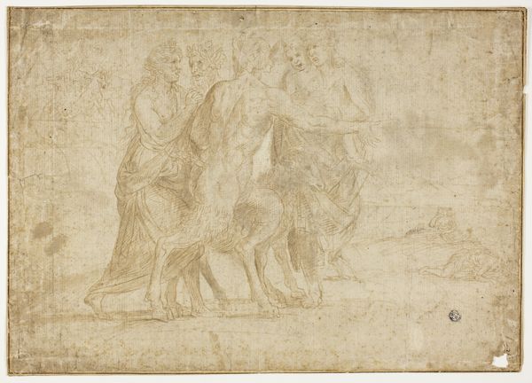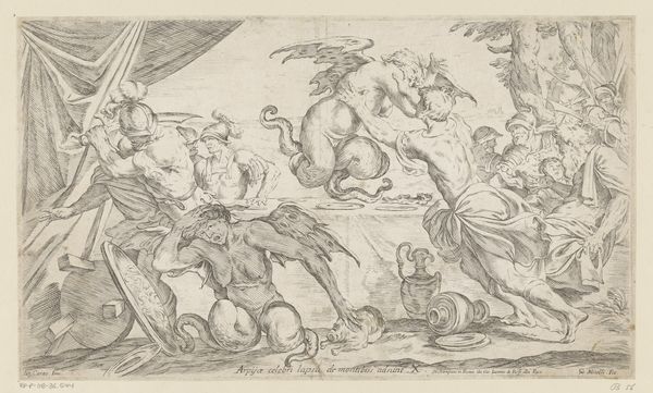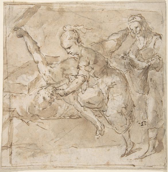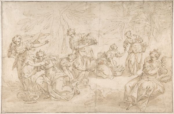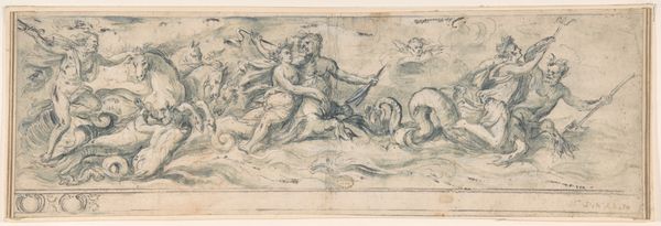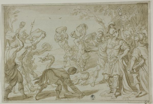 Curator: Welcome. Here we have Battista Franco’s drawing, "The Flight of Cloelia," likely created between 1545 and 1551. Rendered in charcoal, this piece captures a dynamic moment, now housed here at the Minneapolis Institute of Art. Editor: My first impression is one of breathless urgency. The monochromatic palette adds a stark drama, and the figure on horseback seems to burst from the static group on the left. Is this supposed to be a scene of...escape? Curator: Indeed. Franco illustrates the Roman legend of Cloelia, one of the young Roman women held hostage by Lars Porsena. Cloelia bravely led an escape, famously swimming across the Tiber to return to Rome. It became a celebrated tale of Roman courage and virtue. Editor: It’s interesting how Franco uses the medium itself to amplify this sense of urgency. The charcoal seems almost smeared in places, heightening the drama. Are those Roman soldiers looking on, trapped and despairing as she makes her bold getaway? Curator: Precisely. You can see that he effectively differentiates Cloelia’s dynamic movement from the rest of the subdued figures who stand back, frozen by her actions and likely aware of the implications for themselves. It’s fascinating how art reflects the cultural values and political undercurrents of its time. The artist chooses to present a powerful act of female agency for the public, imbuing it with Roman bravado. Editor: Yet I can't help but view it through a contemporary lens. The scene invites us to reflect on gender roles, courage, and the historical narratives that have shaped our understanding of women in positions of power. Also the horse itself! The scene’s charged moment hints to me at the symbolic association of freedom and agency represented by the means of Cloelia’s escape. Curator: And consider the piece’s original function. Likely intended as a study for a larger composition or engraving, it speaks volumes about the artistic process in the Renaissance. Also the choice of charcoal itself indicates an immediate approach and the development of complex images. Editor: I'm struck by the way the artist invites a dialogue between historical narrative and potent immediacy, pushing me to reconsider classical bravery, and the women who were written out of the cannon, but bravely showed up and fought hard. Curator: "The Flight of Cloelia" grants us entry into a dialogue on politics and bravery across centuries. It prompts us to examine the legacy and complexity surrounding representations of heroism and courage, particularly regarding female power.