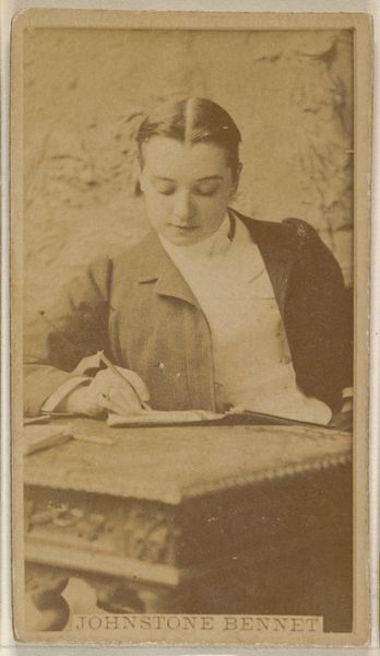 Curator: The mood of this photograph strikes me immediately. There’s a quiet confidence, perhaps even a hint of intellectual challenge in her gaze. Editor: This is a photographic portrait, made on paper, sometime between 1900 and 1914 by Willy Frohsinn. The title translates to "Portrait of an Unknown Woman," which, given the time period, immediately invites questions about class, access to photographic portraiture, and the social construction of female identity. Curator: Precisely! The “unknown woman” is precisely the point, isn't it? Her identity, seemingly obscured, compels us to question whose stories are told and whose remain invisible within historical narratives. Her dress and setting point toward middle class status, but even that’s a construct within a photograph like this, designed to portray respectability and perhaps a degree of aspiration. Editor: Indeed. Studios like Frohsinn's played a critical role in shaping public perception during that period. This image exists at the intersection of private identity and public performance. How did the sitter want to be seen, and how did the photographer help to shape that vision? It's also fascinating how photographic realism in this period engaged with Academic Art's focus on faithful representation. Curator: The opened book suggests an engagement with knowledge, maybe even art itself if you consider the date. It invites questions about women’s roles in early 20th-century intellectual and cultural life. I’d be interested to analyze the visual rhetoric deployed to construct the subject as someone both intelligent and feminine. Is the book a tool of empowerment, or a prop? And what can that tell us about the role of gender in defining selfhood at the turn of the century? Editor: That open book speaks volumes, literally. It's also important to remember how portraits such as this would circulate. Consider the potential viewers, the photographer's intention in offering these types of images, and the subtle ways in which socio-political ideas were transmitted and reinforced. Curator: This image is an entry point to a conversation about representation. It can help visitors explore gender roles, class structures, and even the very act of image-making within that era. Editor: Absolutely. It serves as a tangible reminder of the complex web of social forces that shape both the creation and reception of art.