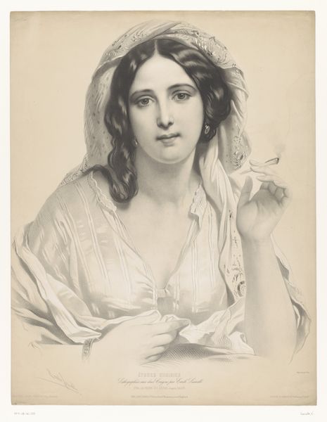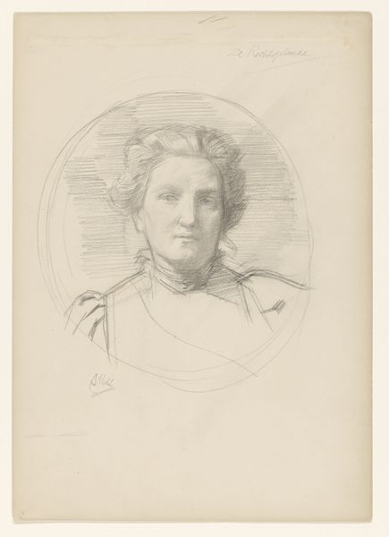 Curator: I’m so drawn to the subtle melancholy in this print, "Kvindehoved. Italienerinde"—or "Female Head. Italian Woman"—created by Axel Hou around 1899-1900. It's rendered in ink and etching, giving it this lovely textured feel. What do you think when you first see her? Editor: She feels like a question. All that delicate shading and the way her eyes seem to look right *through* you... it’s unnerving, but in a compelling way. There’s a weariness there, an acknowledgment of something. Curator: Exactly! I think Hou perfectly captured that fleeting, in-between moment. Notice how the loose curls frame her face, softened further by the hazy rendering that still conveys an amazing sense of her bone structure. Those sharp angles around her jaw and cheekbones tell such a story of resilience. It's all about Art Nouveau embracing realism, wouldn't you say? Editor: Absolutely. Those curls remind me of Medusa's snakes, though softened into something less overtly threatening. The averted gaze, slightly downward, is such a potent symbol too—traditionally it speaks of modesty, perhaps even sorrow, but there's a subtle defiance present. It hints at layers beneath the surface. What's your take on that earring she’s wearing? It stands out. Curator: The single earring is interesting—could symbolize incompleteness, longing, a yearning for something lost? Or even perhaps it marks her out as “other”, as a foreign presence? This feels like a bridge between outward appearances and an internal emotional landscape. Editor: Right! In a portrait, the act of looking, both by the subject and the viewer, is key. She isn't just *being* looked at; she's presenting a carefully considered version of herself—her dress plain but a knowing look. Curator: Precisely, she invites you in, even if cautiously. She leaves you contemplating untold stories about the lives of women from this era. Editor: It makes me wonder who she was, her name, and if she was ever aware of this portrait made of her that outlasted her. A captured moment for posterity that is both hers and no longer hers at all. Curator: Such strange alchemy in turning lived lives into artwork. Editor: So true, something powerful lingers here beyond a pretty picture.