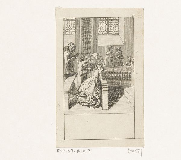 Curator: What a delicate scene. "Interieur met vrolijk gezelschap," created around 1778 by Daniel Nikolaus Chodowiecki. It’s currently held at the Rijksmuseum. The medium is listed as engraving. Editor: Yes, immediately striking is the intricacy, given the medium. It’s rather small scale, but somehow, it manages to convey the atmosphere of a grand, bustling salon. Curator: Absolutely. Chodowiecki was masterful in capturing the spirit of his time, offering a window into 18th-century social life. Engravings such as this one were widely circulated, democratizing art, and imagery. Consider the social function of distributing these scenes of fashionable sociability to a broad audience. Editor: Right, and it's also worthwhile to examine the labor involved in producing such a detailed print. How long would it have taken Chodowiecki to create the plates, and what kind of tools did he use? Curator: Good point! The engraving process itself required immense skill. Look at the cross-hatching; each line contributes to the shading and volume. Then consider the types of labor being represented in the image: leisure activities afforded by aristocratic privilege, versus the manual skill necessary to replicate and distribute these images to a middle class increasingly able to afford them. Editor: What is the subject precisely? Is there a narrative? A specific event perhaps? Curator: It appears to be a genre scene: a snapshot of an animated gathering within a well-appointed interior. It seems as if a man bows to acknowledge a women within the party, so this image captures everyday interactions rather than an explicit historical event. This emphasis reflects the shifting tastes of the era and the expanding market for images reflecting everyday life. Editor: How fascinating to consider how the consumption of art reflected social and political shifts! It's a glimpse into a world both similar to and incredibly distant from our own, preserved by craft and a printing press. Curator: It truly is, a lasting example of art as social commentary, captured through skillful production.