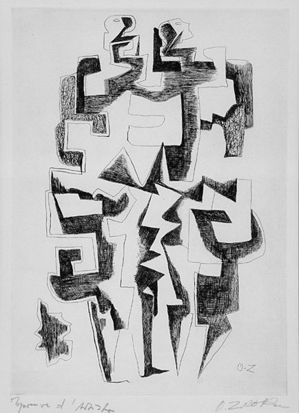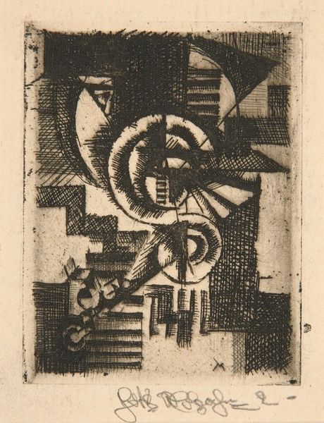 Johannes Molzahn created this print, titled "Far-Feeler," using etching, a traditional printmaking process. The matrix for this image was a metal plate, likely copper or zinc. Molzahn would have coated the plate with a waxy, acid-resistant ground, then scratched his composition into the surface, exposing the metal. When the plate was immersed in acid, the exposed lines were bitten, creating recessed marks. Ink was then applied to the plate and the surface wiped clean, leaving ink only in the etched lines. Finally, damp paper was laid on the plate and run through a press, transferring the image to the paper. The resulting lines are crisp and precise, giving the composition a machine-made quality, belying the labor-intensive process. The image itself is an amalgamation of geometric forms and stylized figures, suggesting the influence of both Constructivism and Surrealism, both of which emerged in response to industrialization and modern life, using the very tools that defined these shifts. Recognizing these processes allows us to appreciate the rich dialogue between handcraft and machine production that defines much of modern art.