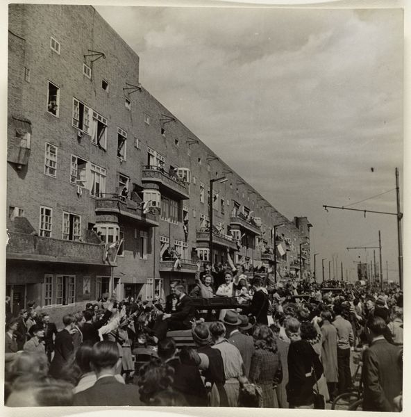 Editor: Here we have Robert Frank’s gelatin silver print, "Armistice Parade, Geneva," from 1945. It captures a street scene filled with people celebrating. I’m struck by the texture in the print and how it lends a gritty feel to the celebratory mood. What details stand out to you? Curator: Immediately, my eye goes to the photographic materials and process. Gelatin silver prints allowed for mass production. In that sense, this image isn’t about individual artistic expression, but about capturing a shared social moment for broad consumption. Editor: Interesting. So you’re thinking about how this celebratory moment was, in a way, manufactured for a wider audience? Curator: Precisely. Consider the historical context. It was 1945. People yearned for an end to conflict and austerity, yet photographic materials were rationed or directed for military ends. Capturing this event, and the materials used, reflects an opening, an access that also meant a consumerist access to the image of peace. Editor: I didn't think about the accessibility of photography back then. Curator: Look also at how Frank, while documenting a seemingly joyful occasion, offers subtle cues about the construction of national narratives. Flags and carefully organized marchers – aren't those, in themselves, produced and regulated materials? Editor: So, even the flags represent access to resources after years of scarcity, but also the way those resources build national pride? Curator: Yes. Frank implicates himself, and the viewer, within a network of materials and manufacture designed to express these values. This understanding moves us beyond simply looking at the picture towards looking at how it was made, why, and for whom. Editor: I've never considered an image this way. This photograph becomes much more than just a scene. It’s about what its existence represents within a specific economic climate. Curator: Precisely! Examining the means of production opens doors to understanding larger cultural narratives.