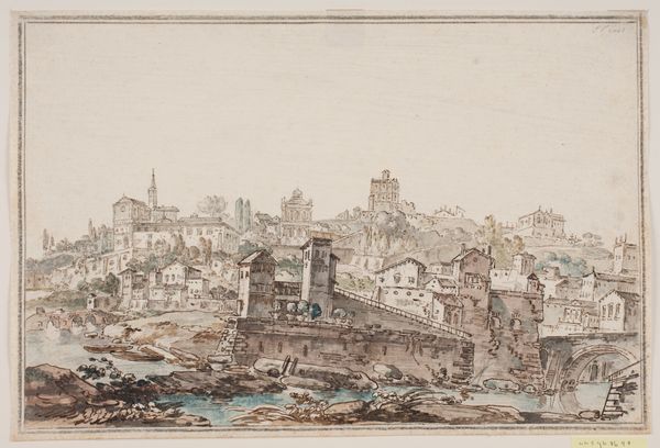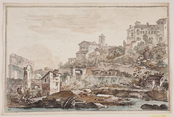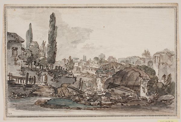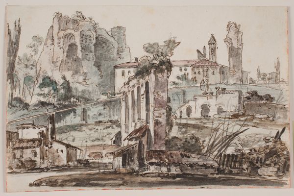 Editor: This is "The Interior of the Colosseum, Rome," a watercolor and ink drawing made sometime between 1730 and 1793 by Jens Petersen Lund. It strikes me as an interesting interplay of light and shadow, but I am struggling to grasp what's being represented. What do you see in this piece? Curator: The primary subject is of course the Colosseum, presented here through a study in architectural form. Observe the artist's use of line – the delicate yet precise rendering of the ruins contrasts markedly with the looser application of washes suggesting vegetation. The work presents the structure's decaying presence within its wider setting. Do you notice any geometric patterns that capture your eye? Editor: Now that you point it out, I do see the recurring arches, and the contrast between the geometry of the ruins and the organic shapes of the trees does stand out. So you're focusing on the lines and shapes themselves. Curator: Precisely. Notice also how the artist employs a restrained palette, predominantly monochromatic, yet uses subtle variations in tone to articulate depth and texture. It serves to flatten and compress our reading of the landscape elements. This imbues the composition with a feeling of serene decay, wouldn’t you agree? Editor: I see what you mean about the "serene decay." I hadn't considered how the limited colors add to that feeling. Thank you for showing me a new way to analyze drawings! Curator: You're most welcome. Art reveals more when one examines its intrinsic qualities first. It’s also quite lovely in its tonality.