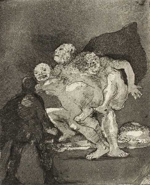 Curator: Welcome! Here we have Oluf Hartmann's "Two Women Fighting over a Man," an etching and aquatint from 1907. Editor: Right away, I’m struck by the density of the composition and the rawness of the figures. The figures intertwine violently, bathed in stark contrasts of light and shadow. It's like a scene ripped from a nightmare. Curator: Hartmann worked during a time when art nouveau was prominent, yet this piece feels almost like a brutal rejection of its ornamental sensibilities. The harsh lines, the grotesque features... it all serves a darker narrative. Editor: It really does subvert art nouveau ideals. These aren’t idealized women gracefully adorning a scene; they're engaged in a primal struggle, vying for dominance. It speaks to power dynamics and perhaps a critique of societal expectations placed upon women in relationships. I also see a dark caricature of traditional gender roles. Curator: And observe the man—he is merely an object. Hartmann uses stark contrasts to further push against ideas prevalent in the time. While we could talk about what defines art nouveau versus art within Scandinavia at the turn of the century, the composition and characters chosen demand the piece be interpreted more holistically within that period. Editor: Exactly! Is Hartmann reflecting on the objectification inherent in patriarchal systems? The etching technique only intensifies this tension; the lines seem almost scratch-like, conveying agitation and violence. It asks: What is this competition doing to these women? What does "winning" even mean? Curator: Certainly, he offers a glimpse into the less refined aspects of human desire, revealing tensions hidden beneath societal norms. This piece can invite us to question the romanticized portrayals that so often dominate depictions of love and relationships, but in ways that challenge norms rather than reinforce them. Editor: It is really thought-provoking how the title tells a clear story but still leaves a lot open for viewers to interpret in terms of broader societal commentary. I’ll definitely be thinking about this for a while! Curator: Indeed, a powerful image that continues to resonate and invite questioning, even today. Thank you for joining me!