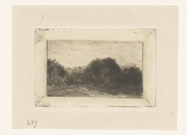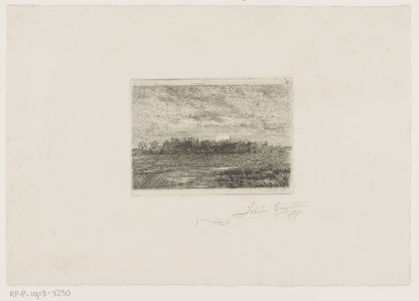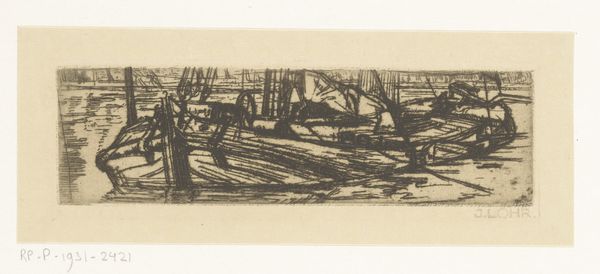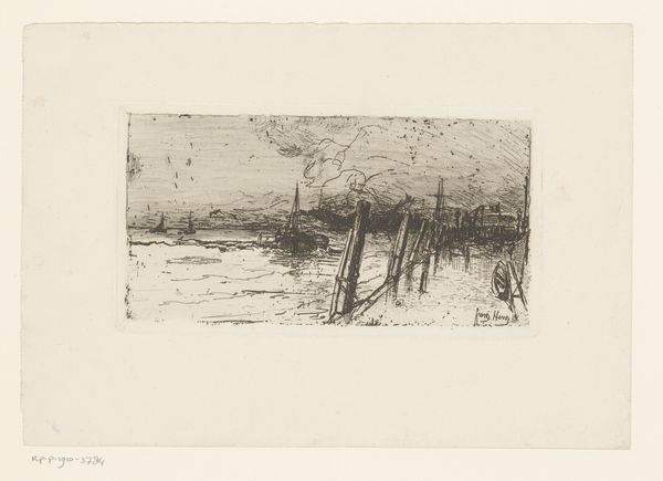 Curator: Floris Verster's 1890 etching, "Schepen in Haven," captures a harbor scene with an incredible flurry of lines. The print is held here at the Rijksmuseum. Editor: It's wonderfully frenetic, almost like a storm caught on a plate. There's such a strong sense of energy and industry here. Curator: The etching process really lends itself to that energy. Think about it: the artist dragging a needle across a metal plate, building up these complex webs of lines. It’s labour-intensive but allows for an incredible level of detail, albeit one in monochrome here. Editor: Monochrome emphasizes the material aspect; every tonal difference results directly from labor applied to a surface with tools. Also, note the reflections on the water — so cleverly achieved through the varying density of the etched lines. It’s practically vibrating. Curator: And Verster wasn't afraid to leave marks, either. Look at the haphazard lines above the ships themselves—they seem unfinished but still suggest the vastness of the sky and harbor. It almost reminds me of the quickness you see in some late Turner watercolors, but in reverse! The absence suggests presence here, much like in Impressionist painting. Editor: I see those raw marks less as about landscape or suggestion but more about economy of labor. I bet he made a whole series of harbor prints as part of a product for mass-market consumption. To get the job done quick, use line, but use line efficiently! This may be about industry in practice, as well as image. Curator: Well, whether intentional or just from the process, those open areas make the few distinct details sing. That single white sail catches the light perfectly! You get such a feeling of being on the docks, watching the masts sway. Editor: Fair point. The interplay of light and shadow are nicely crafted, whatever the intent or social impetus. Still, what strikes me is the sheer effort etched (pun intended) into every square inch of this little etching. Curator: So true. There is just such a personal investment in it! Well, hopefully listeners will go view it in person if they get the chance, or examine it more closely online to see for themselves! Editor: I agree. Every score mark here speaks volumes about the creative process in its social setting and the industrial methods used to create its aesthetic values. It is up to the individual what values or narratives that they discover in this intense but serene landscape.