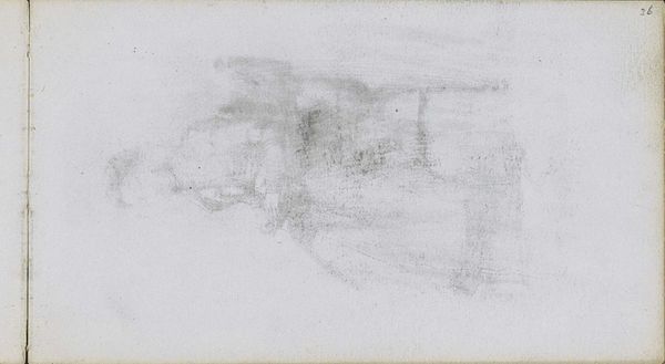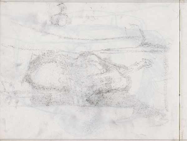 Curator: Welcome. We’re standing before Isaac Israels’s “Abklatsch van de krijttekening op blad 3 recto,” a drawing created sometime between 1875 and 1934, now held in the Rijksmuseum collection. Editor: My first impression? Ghostly. It feels like peering through layers of fog at… well, at something obscured, almost intentionally so. Curator: That feeling is largely generated through his chosen materials: pencil and, what appears to be, a watercolor wash on paper. But consider what "Abklatsch" implies: an offprint, a reproduction. This brings the labor of reproduction and the industrial printing press into the artistic process. Editor: True. The visible grid and almost repetitive mark-making lends credence to its mechanical nature, an abstraction of the artist's hand. But what’s fascinating to me is the push and pull of tonal variation within an economy of means, the balance between light and dark... Curator: Balance? Or perhaps an inquiry into value? Given its probable origin within a book or magazine’s production process, it's engaging with ideas about accessibility and commodification of images. This elevates a mere utilitarian, functional object. Editor: That’s a persuasive point about accessibility. But the aesthetic of those indistinct shapes, the varying pressures of the pencil, and that accidental watercolour effect create its distinctive effect; it evokes, even if it doesn't declare. Curator: Indeed, there's tension here. An unexceptional mass produced page bears its history, alluding to something far removed from notions of “artistic genius.” Editor: I appreciate the way it straddles that line. Even the visible imperfections - creases, stray marks, slight abrasions - become part of its peculiar beauty. Curator: Yes. And that, perhaps, draws out our own material investment as viewers too. Editor: It is strange. Looking again, I concede it might well be something beyond its inherent aesthetic and material makeup; something far greater after all.