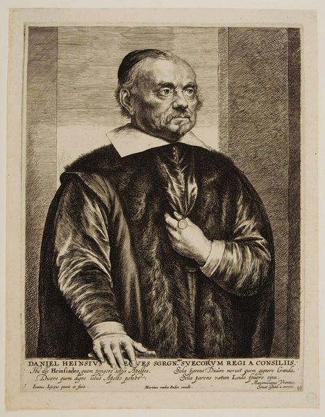 Curator: At the Harvard Art Museums, we have Jan Lievens' portrait of Daniel Heinsius. There is no date on this one. Editor: Well, I'm immediately struck by how…serious the subject seems. A little dour, almost. Curator: Heinsius was a prominent Dutch scholar, so the gravitas feels appropriate. Lievens really captures the intellectual weight. Editor: Absolutely, and there is something performative about the man holding that plume, I imagine. I wonder about the politics of portraying intellectuals in positions of power during the Dutch Golden Age. Curator: Interesting point. Maybe Lievens is hinting at the influence of knowledge, the power that resides in academia. Editor: Food for thought. It makes you reflect on how images reinforce societal structures and hierarchies. Curator: Indeed. This portrait makes me consider the sitter and artist, while also encouraging a deeper look into that historical moment.