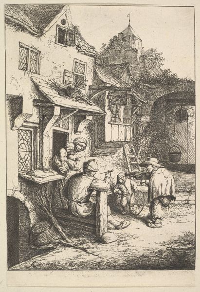 Editor: So, here we have "An Italian Musician Sitting in an Open Door," created by H. C. Henneberg in 1844. It's a woodcut, giving it this striking linear quality. I’m struck by how this simple scene hints at a larger narrative. What can you tell me about its place within its historical and cultural context? Curator: This piece, created in the mid-19th century, taps into the popular fascination with genre painting and the figure of the wandering musician, a symbol that resonated deeply within the socio-economic changes occurring across Europe at the time. Henneberg isn't just portraying a scene; he’s participating in the ongoing construction of ‘national’ identities, particularly in how certain groups – like the itinerant musician – are romanticized or marginalized. Does the framing of the doorway suggest anything to you about how Henneberg views his subject? Editor: The doorway almost seems like a stage! A curated view. I wonder if that framing turns him into more of a spectacle? Curator: Precisely. It makes you consider the perspective from which we’re invited to observe. Is this an intimate glimpse or a distanced viewing? Consider too, how images like these circulated; were they aimed at a local audience, reinforcing familiar stereotypes, or destined for broader distribution, shaping external perceptions of Italian identity? Editor: It's interesting how what appears to be a simple genre scene becomes loaded with questions of representation and power. It’s not just about the musician’s story, but *whose* story is being told and *for whom.* Curator: Exactly. It makes you aware of how easily art can perpetuate cultural narratives, and the responsibility of the museum in presenting that history. It challenges us to think critically about how these images have shaped our understandings. Editor: It's made me reconsider my initial viewing; from a simple slice of life, to a statement of the role and status of both subject and viewer.