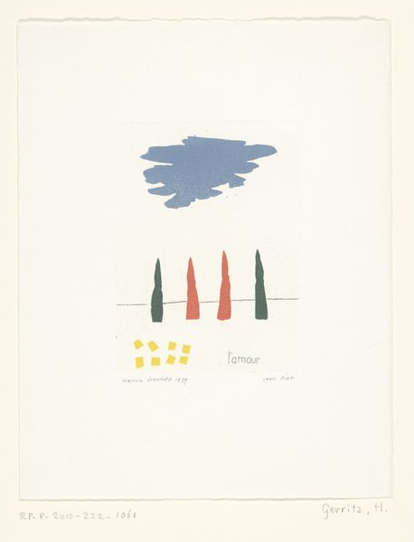 Harrie Gerritz made this print, "Oranje toren in groen veld," using decidedly simple lines and colours. It has a child-like charm to it, almost like something you'd find decorating a kindergarten classroom. Look at how the green lines of the field don't quite line up with the tower – it's this delightful off-kilter quality that makes it so appealing. The textures are also fascinating. The orange tower stands out as an unusual form with a white highlight, and I get the feeling that he or she used their finger to create the impression. You know, this little print reminds me a bit of Milton Avery, just in its playful approach to colour and form. There's a shared love for reducing things to their most basic elements, but still finding a way to express something profound. Art is just a conversation, isn't it? It's like we're all talking to each other across time.
