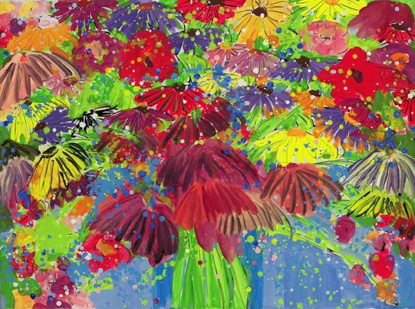 Walasse Ting created 'Blue Vase, Many Flowers' with broad, vivid strokes of watercolor. Ting was a Chinese-American artist, and his work often served as a vibrant bridge between Eastern and Western aesthetics. The work merges traditional Chinese ink painting techniques with the bold, saturated colors of Western modernism. Consider the social context: Ting navigated the art worlds of Paris and New York during the mid-20th century. His style counters the austerity of mid-century modernism, embracing instead a playful, almost childlike exuberance. This painting quietly challenges the art world's tendency toward seriousness and formality. Ting’s flowers, rendered with such joy, reflect a broader cultural negotiation between tradition and modernity. To delve deeper, explore the archives of artists who, like Ting, operated between cultures, reshaping artistic conventions and opening new possibilities for expression. Art history helps us understand the social and institutional forces that shape art and how artists, in turn, challenge those structures.