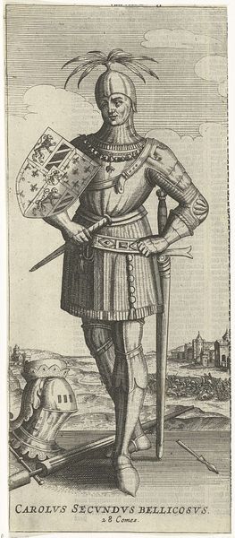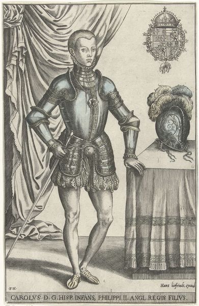 Christoffel van Sichem I created this portrait of Ernst, Archduke of Austria, using woodcut. During the late 16th century, powerful families like the Habsburgs used portraiture to project authority. Ernst's armor, sword, and heraldic symbols aren't just decorative; they're carefully chosen to communicate his power and lineage. The architecture in the background alludes to his dominion over territory and people. It’s as if he's saying, "This is who I am, and this is what I rule." Yet, looking closer, one might wonder about the person beneath the armor. What were his fears, hopes, or vulnerabilities? The engraving captures the visual spectacle of power, but it invites us to consider the complex humanity of those who wield it. How might Ernst's identity and the trappings of power intersect with the lives of ordinary people under his rule?