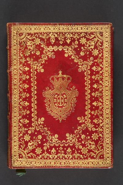 Editor: Here we have the cover of "Manuscript of the Guy u Chawgan (The Ball and the Polo Stick ) of `Arifi", crafted by Mir Ali al Husayni. The gold floral embellishments against that rich red background is visually captivating. What compositional elements stand out to you? Curator: Note the interplay of the central, ornate lozenge shape with the peripheral floral and foliate motifs. This tension creates a balanced, albeit hierarchical, composition. How does the texture influence your reading? Editor: The texture looks smooth, but the details are incredibly intricate. Would you say the artist is trying to convey any messages through this piece? Curator: The visual vocabulary suggests a concern with order and balance. Each element, while decorative, contributes to the overall formal structure. Does this change how you view the piece? Editor: Yes, focusing on the composition makes me appreciate the complexity of its design even more. Thank you! Curator: Indeed. Paying attention to the formal elements can illuminate the artist's intent.